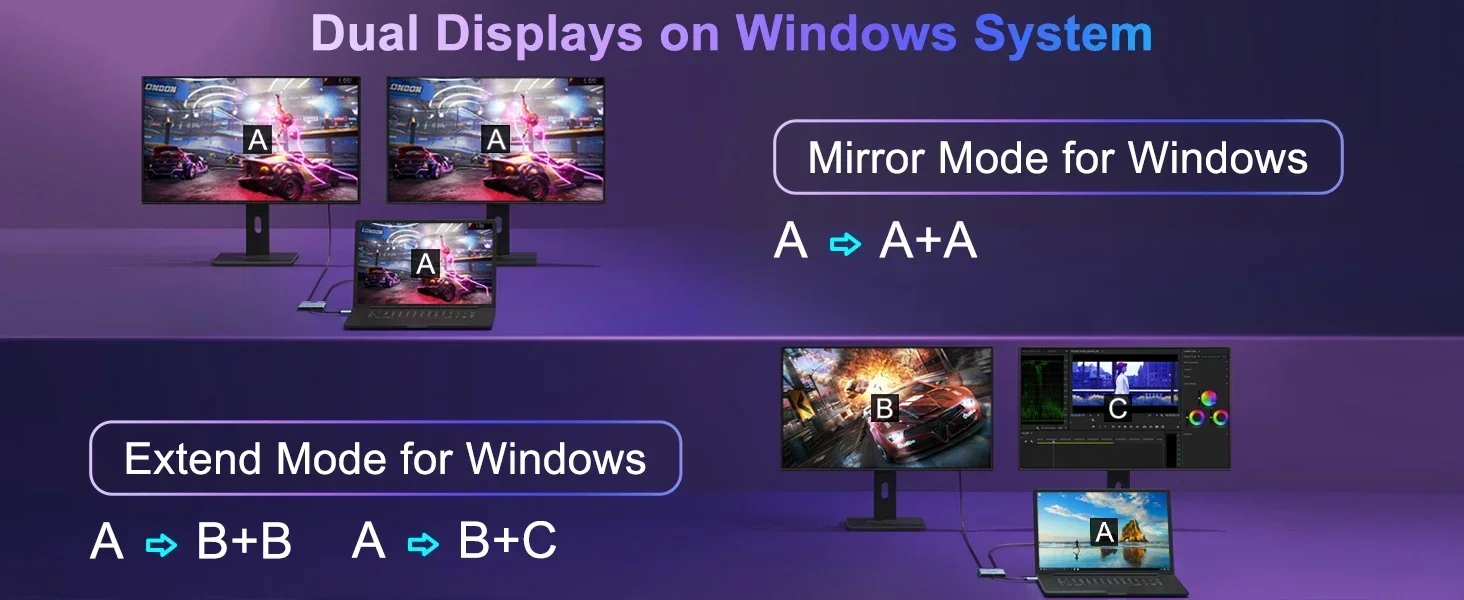 【Adaptador USB 3.0 a HDTV dual】 El adaptador USB C a HDTV dual puede conectar un puerto USB C a dos pantallas HDTV.Nota: El sistema Android solo admite el modo AAA (modo espejo); macOS admite el modo AAA y ABB (no admite el modo MST ABC); El sistema operativo Windows admite el modo AAA, ABB, ABA y ABC.