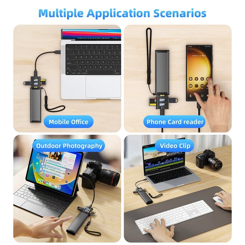 Lector de tarjetas múltiple con soporte para tarjetas. Producto con cable multifunción y adaptadores.