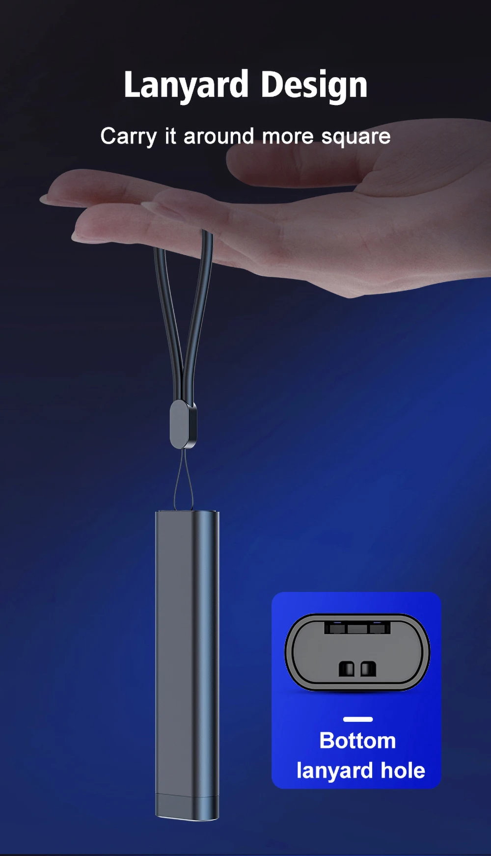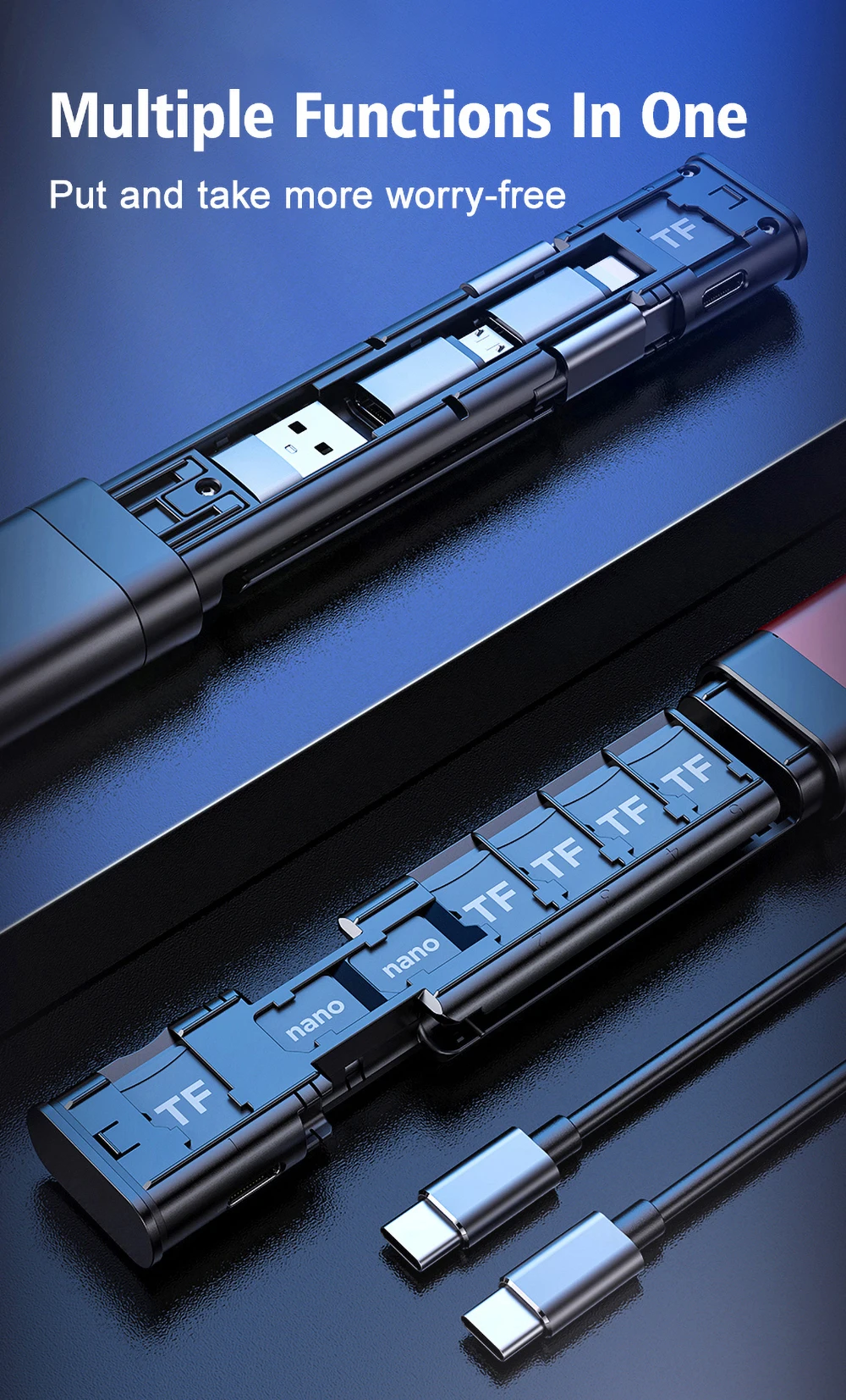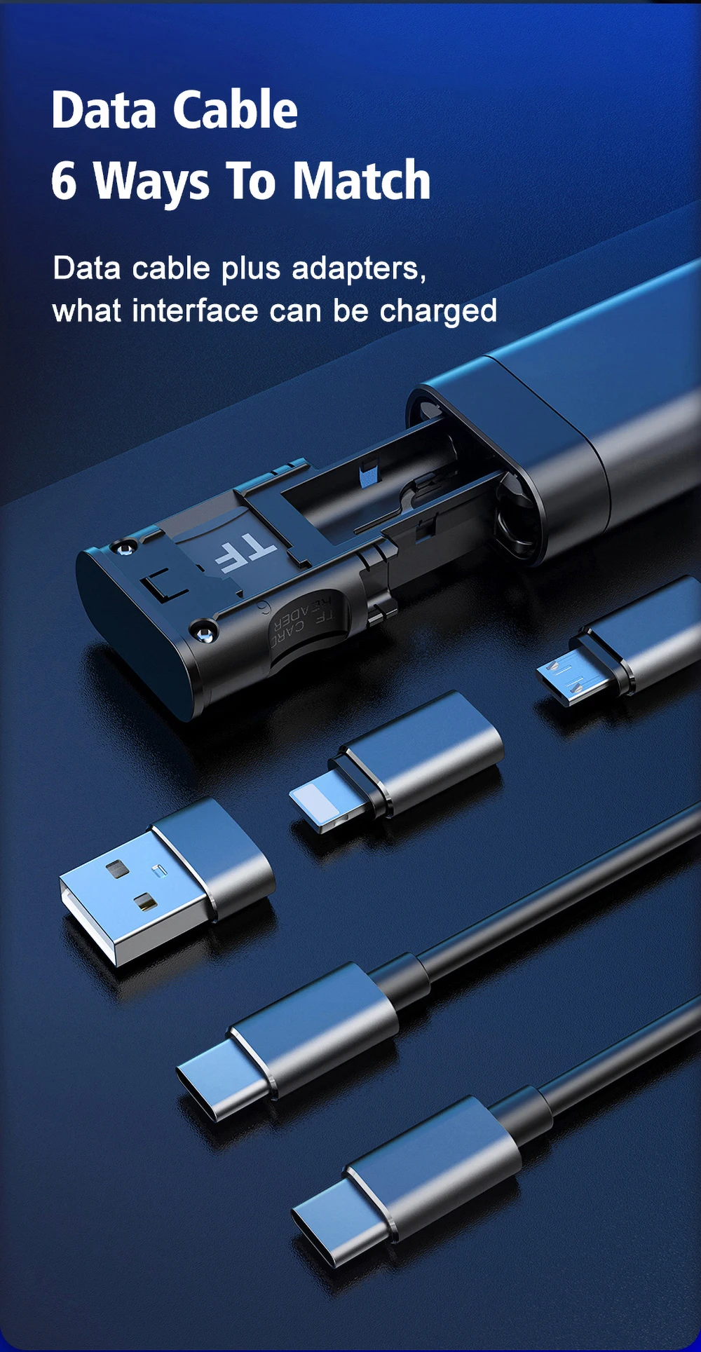 Multi-funcional Cable Stick es un diseño revolucionario que integra todos los conectores de cables esenciales y más utilizados; un cable de cerca de 29cm de tipo C a tipo C con 3 tipos de adaptadores que componen hasta 6 tipos diferentes de cables.