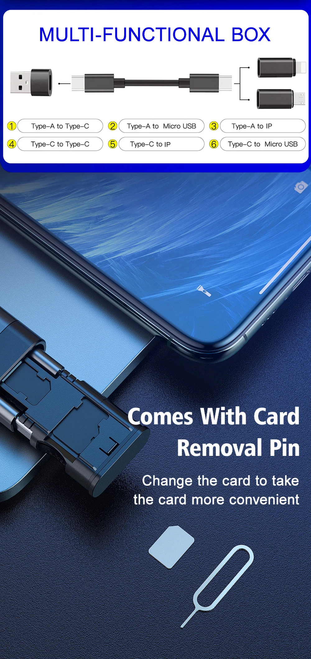 Cuando no hay Internet, no hay acceso al correo electrónico, ¿cómo transferir un archivo a alguien? El palillo multifuncional del cable del Budi puede leer tarjetas de memoria del TF y apoyar el puerto del USB o del tipo C. y al mismo tiempo la ayuda 7 piezas el almacenamiento de tarjeta del TF