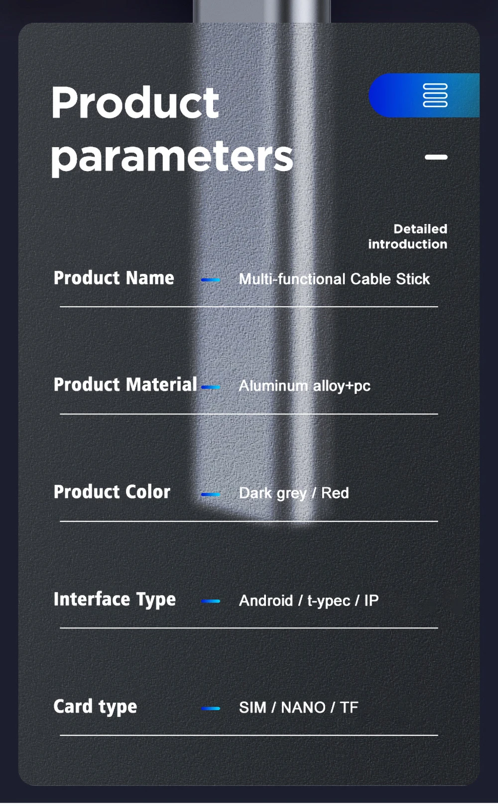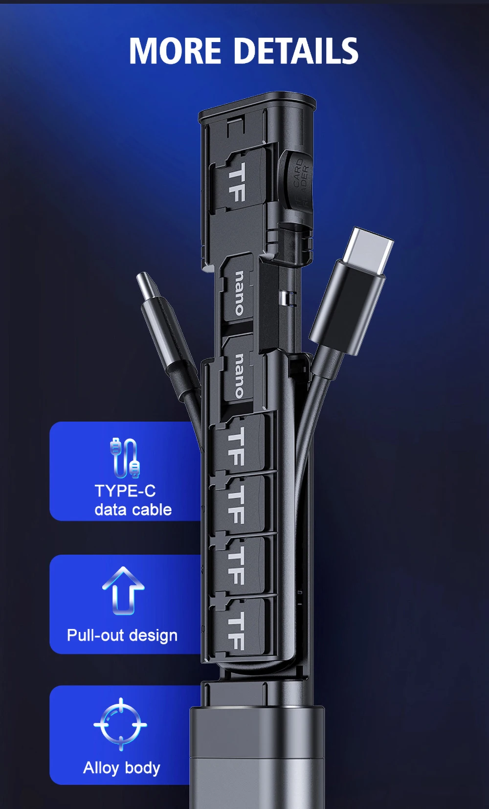 • Multi-Función de datos alambre Rod SIM KIT :Con este adaptador, puede transferir fácilmente datos desde su teléfono a su computadora u otros dispositivos. También soporta tarjetas SIM y tarjetas de memoria.