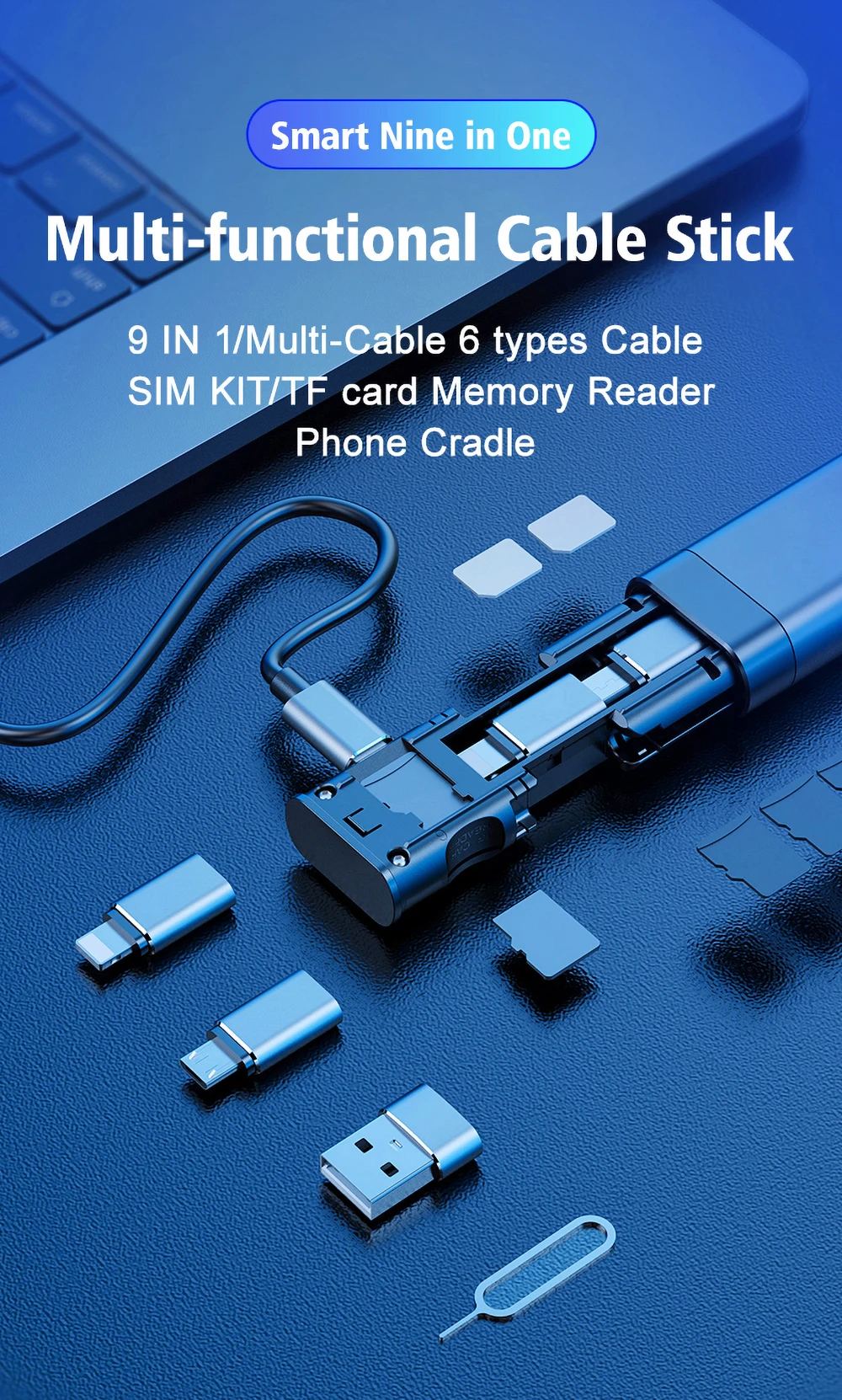 Palillo multifuncional del cable 9 in-1 (multi-Cable 6 tipos Cable, equipo de Sim, lector de memoria de tarjeta del TF, base del teléfono)