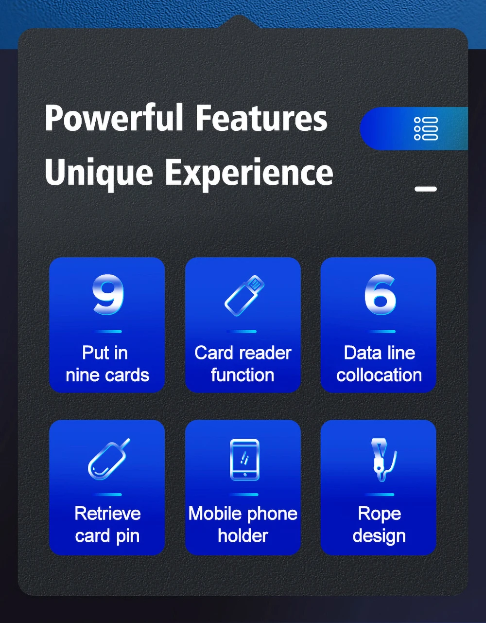 La Caja multifuncional Budi puede ayudarlo y eso incluye un PIN de expulsión SIM, 2 Almacenamiento de tarjeta SIM nano y tiene 2 ranura de almacenamiento de tarjeta TF