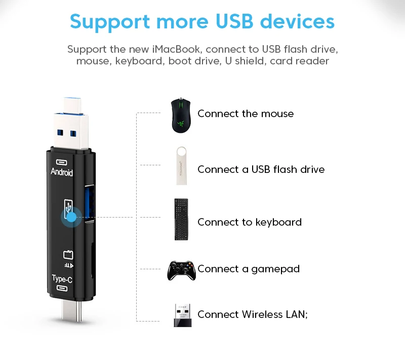 Funciones del producto: USB2.0 macho+MICRO macho+Tipo C macho, tarjeta de memoria TF de lectura de alta velocidad, interfaz USB hembra, teclado externo, mouse, disco U, escudo U, mango de juego y otros dispositivos USB.