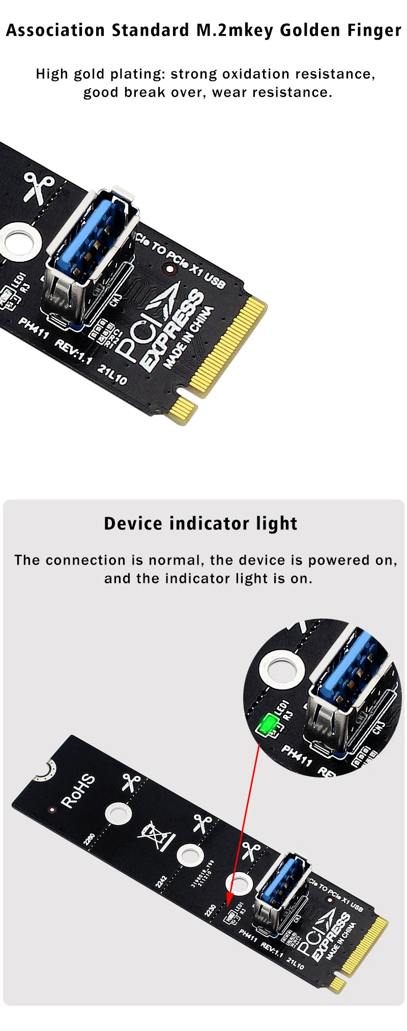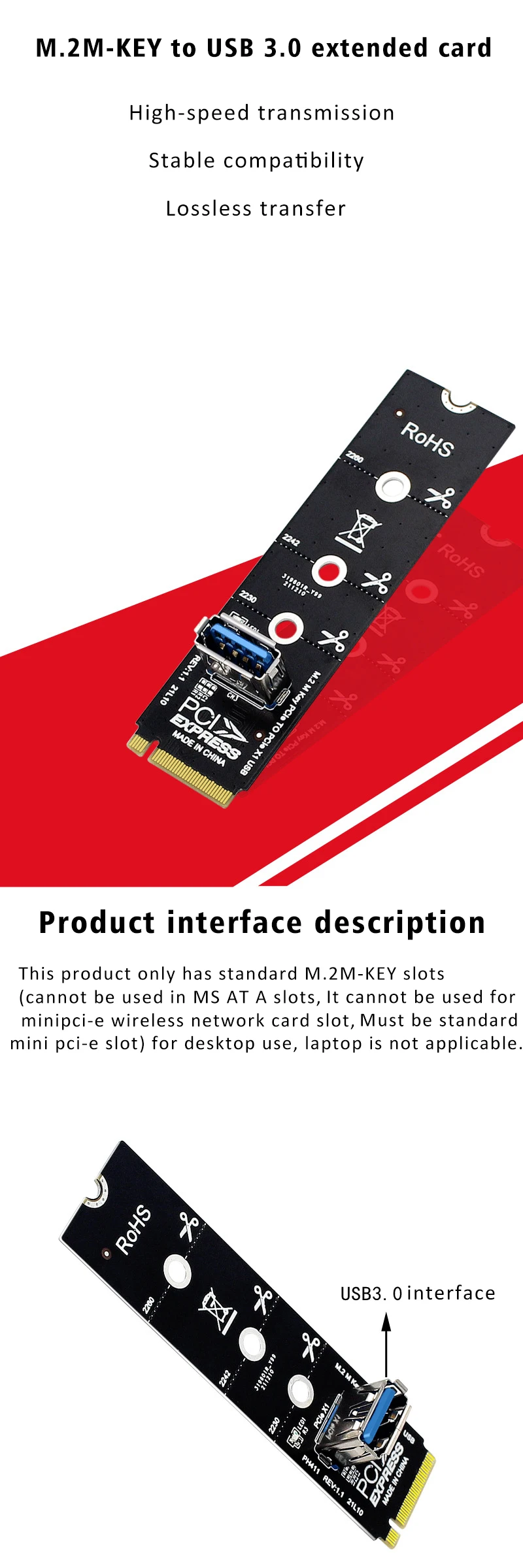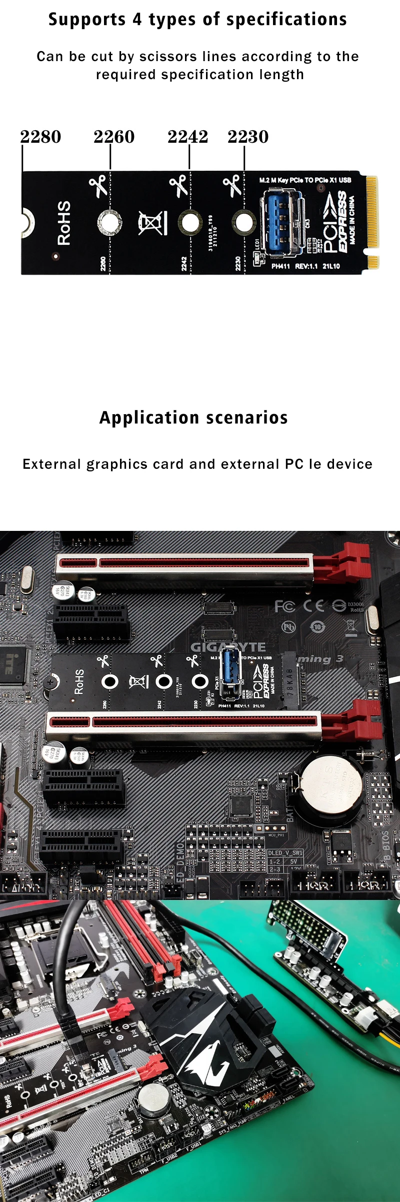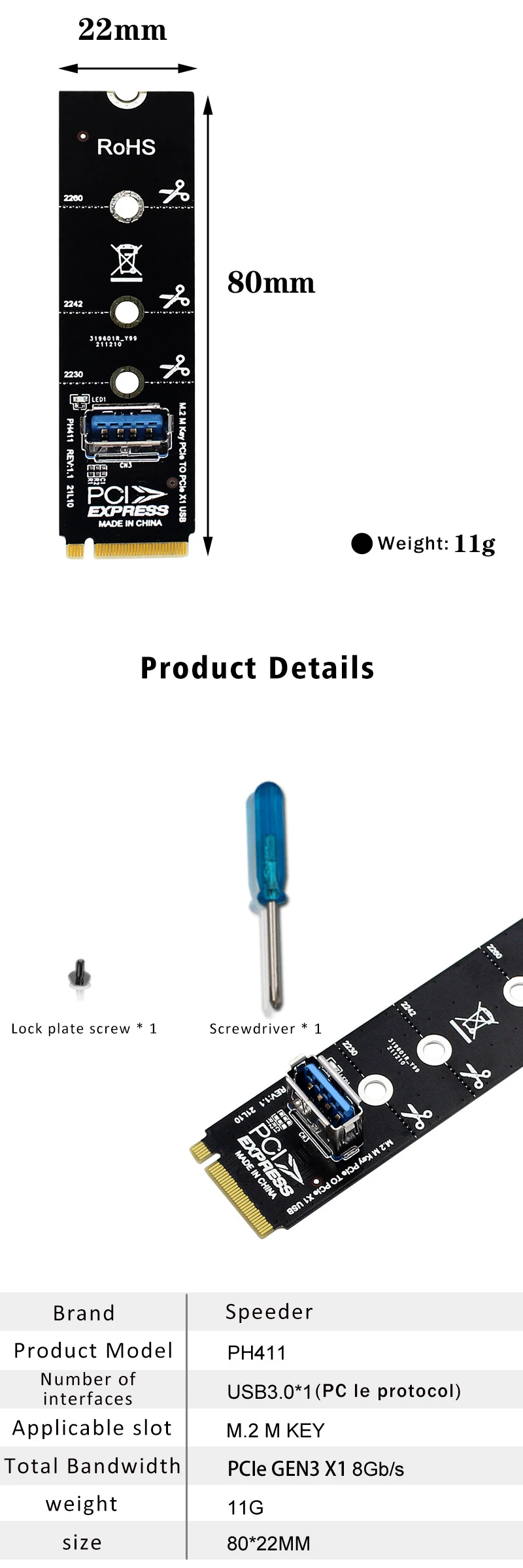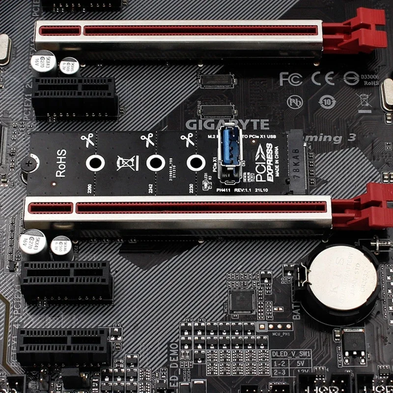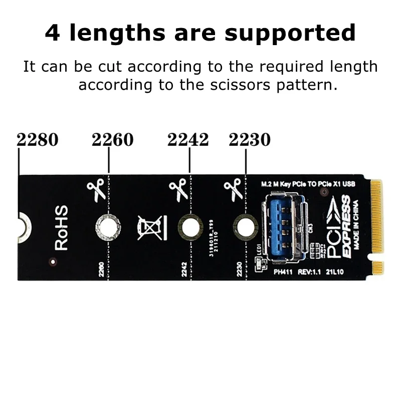 Adaptador NGFF M.2 a USB 3,0 tarjeta de expansión extensor de tarjeta de vídeo gráfica 2230 2242 2260 2280 M2 a PCI-E PCIe X1 extensión de ranura Características: Contacto chapado en oro para una mejor durabilidad y conductividad. Ancho de banda total: PCIe GEN3 X1 8 Gb/s Con orificios para tornillos de 80*22 mm para adaptarse al tipo de ranura de su PC. Convierte M.2/NGFF en puerto USB3.0.