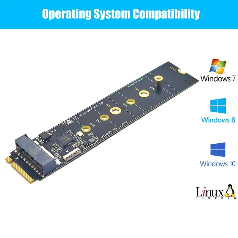 El adaptador puede usar una interfaz NVMe m-key ordinaria convertida a una interfaz b-key M.2 SATA SSD, la placa tiene cuatro orificios de montaje, respectivamente 22*30mm, 22*42mm, 22*60mm, 22*80mm, dependiendo de la longitud de la ranura dentro de su máquina, puede romper el posicionamiento