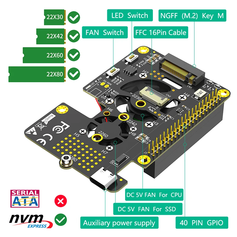 Comprar Adaptador NVMe M Key a PCI-E compatible con 2230 2242 2260 2280 M.2 NVME SSD Cooler Fan RGB LED Dual Switch FFC Cable para Raspberry Pi 5