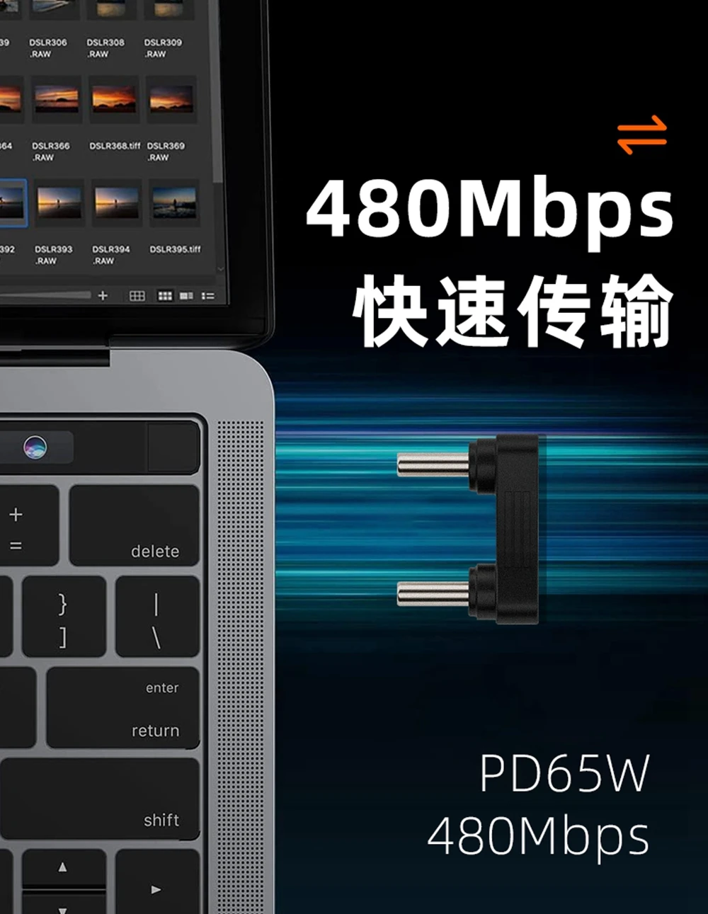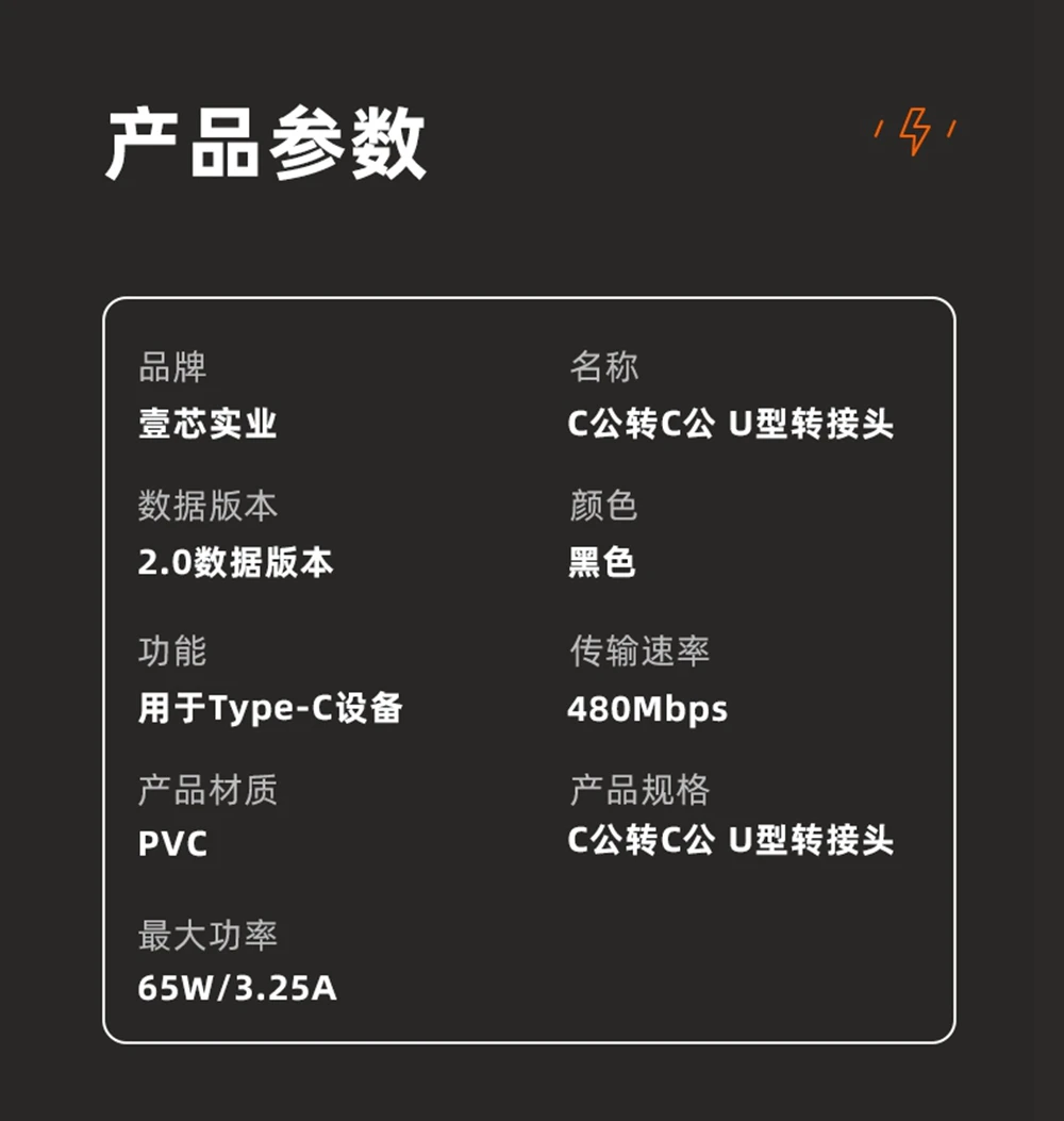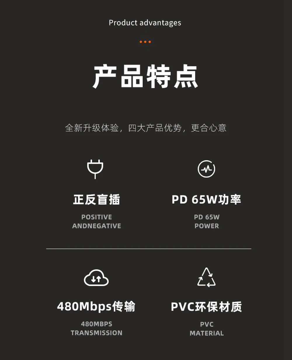 C-type male to male, U-type power charger adapter, PD 65W charging, 480Mbps data transmission.