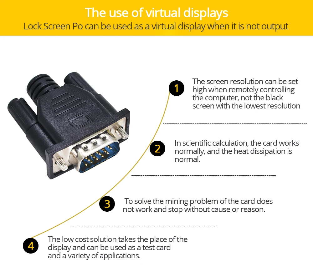 ●Emula un monitor conectado a la tarjeta gráfica.Especialmente bueno para quienes tienen tarjetas gráficas que son incompatibles con simples clavijas ficticias.