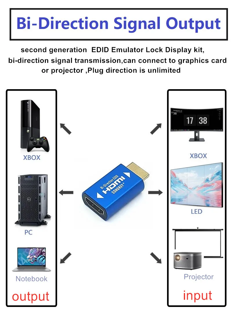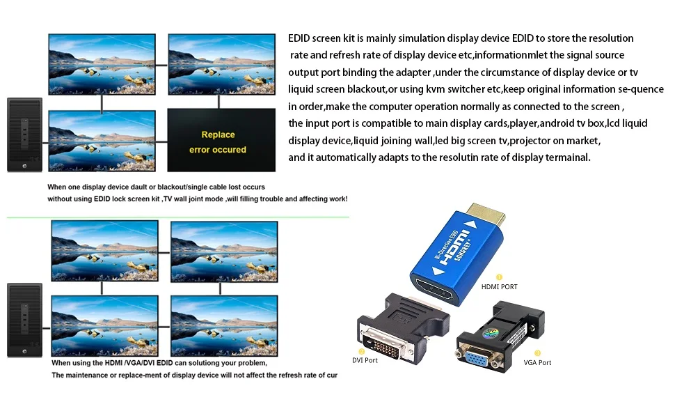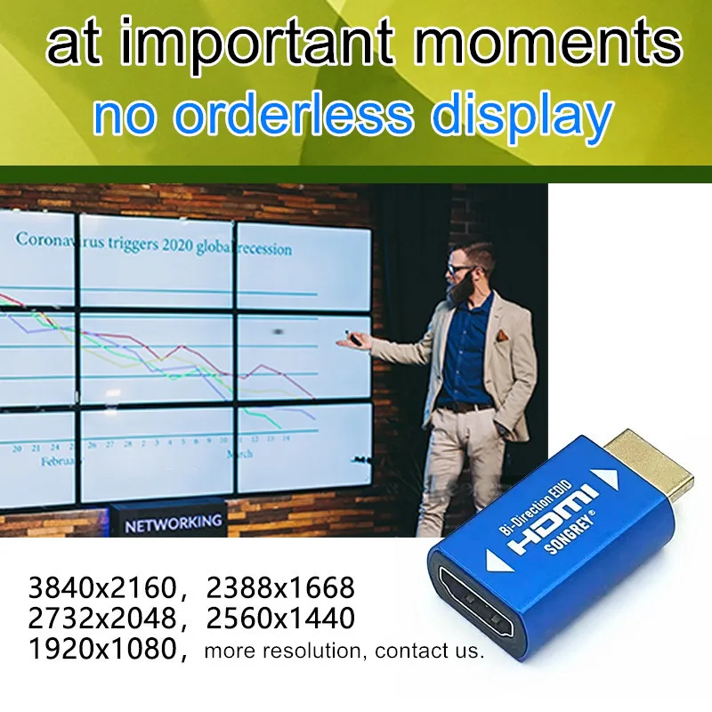 Su función principal es simular la pantalla EDID (datos de identificación de pantalla extendida) y puede almacenar información como la resolución y la frecuencia de actualización del dispositivo de visualización, de modo que el terminal de salida de la fuente de señal esté vinculado a este adaptador para apagar el monitor. o pantalla LCD de TV, o cuando se utiliza un conmutador KVM, la información original y la secuencia aún se pueden mantener, lo que permite que la computadora funcione normalmente como si estuviera conectada a una pantalla.(Se puede utilizar como pantalla virtual, cuando la pantalla está apagada o el cable de la pantalla está conectado en caliente, no puede lograr pérdida de señal de video, no movimiento de pantalla, ni ventanas en funcionamiento ni trastornos de orden)
