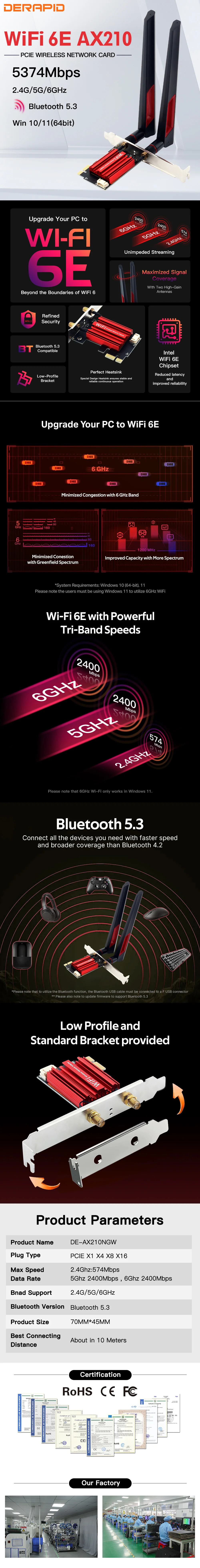 Wi-Fi 6E Triple banda AX210 PCIe WiFi adaptador con 10DBI antenas potentes Bluetooth 5,3 5374Mbps 802.11ax AX210NGW inalámbrico Wifi 6E tarjeta Windows 10/11 Linux
