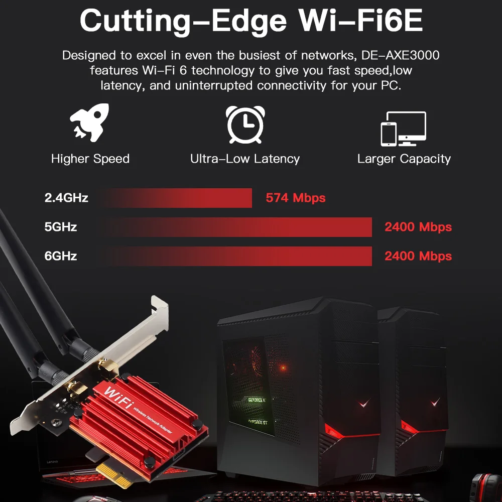 Velocidad hasta2400Mbps(6GHz),2400Mbps(5Ghz), Mbps 574 (2,4 Ghz)(El enrutador debe estar en 160Mhz, compatible con 802.11ax)