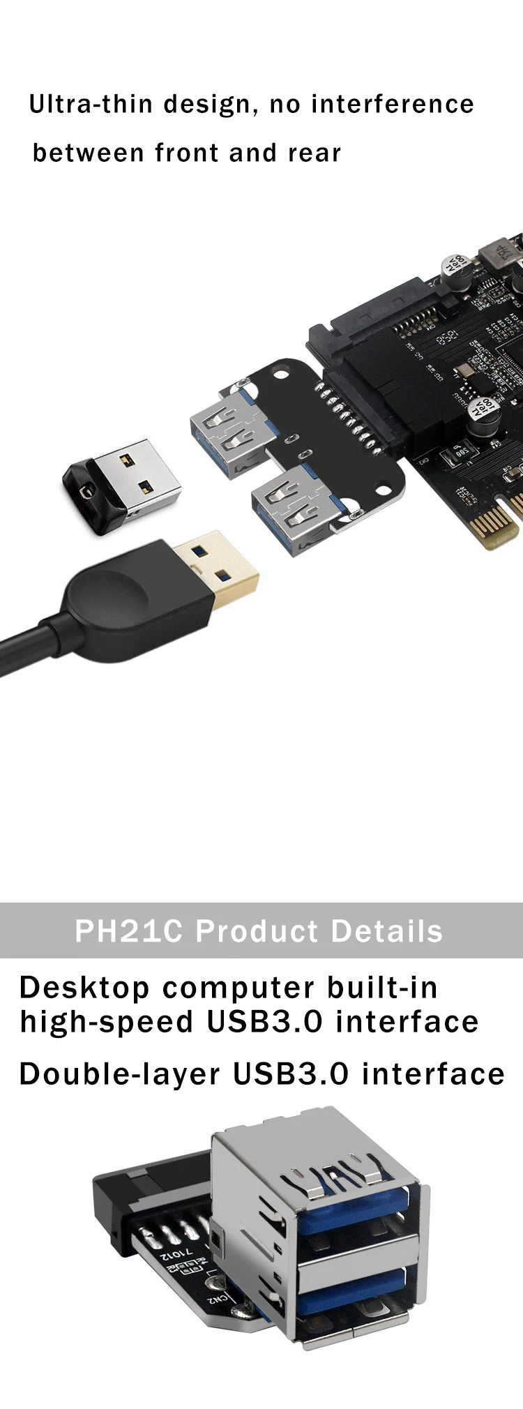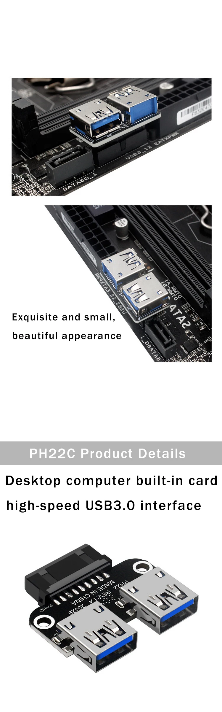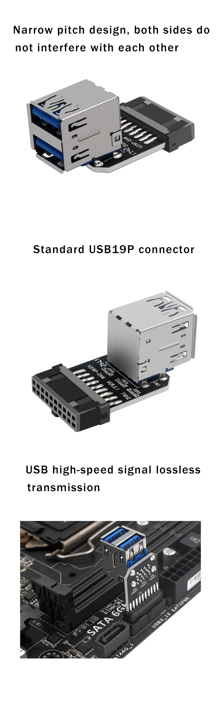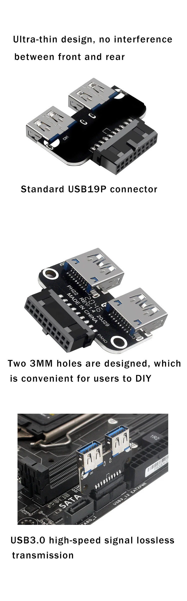 Adaptador de placa base USB 3,0 USB 3,0 19 20 pines hembra a doble USB 3,0 convertidor hembra fuerte antiinterferencias adaptador divisor Característica: 1.Puede usarlo para convertir el conector USB 3.0 de 19/20 pines en la placa base en 2 puertos hembra USB 3.0 tipo A. 2.Con dos puertos USB 3.0 y un puerto de 19/20 pines 3.El uso de materiales respetuosos con el medio ambiente, buena conductividad eléctrica, fuerte capacidad antiinterferente, para garantizar la estabilidad de la transmisión de datos de alta velocidad.