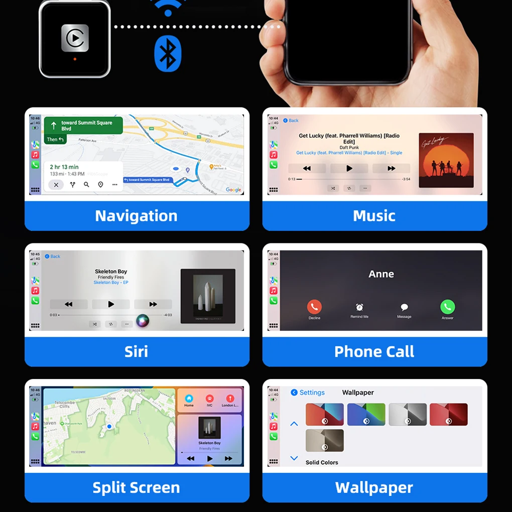 1.Convierta el Car Play/Android Auto con cable original en Car Play inalámbrico/Android Auto, conéctese automáticamente a Car Play inalámbrico/Android Auto después de entrar en el automóvil y conserve todas las funciones originales de ca r Play/Android Auto
