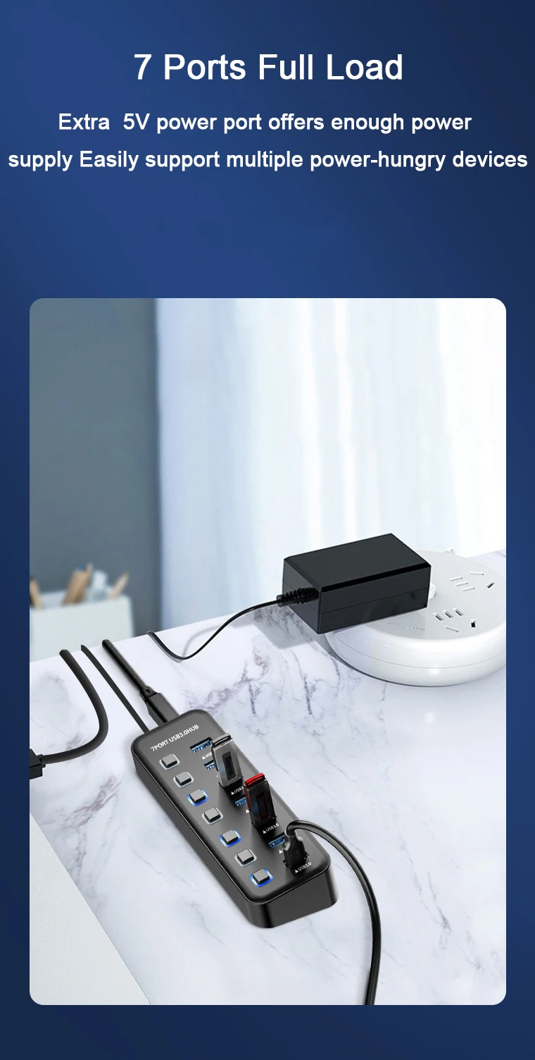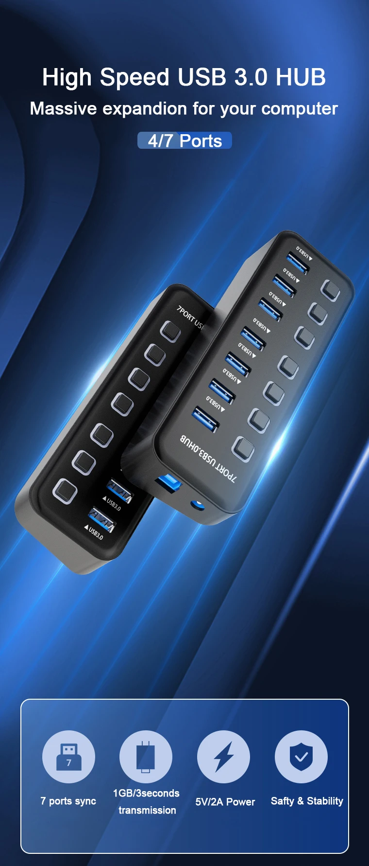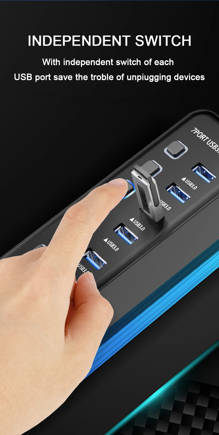 Adaptador de puerto de datos USB 3,0, 4 puertos, 7 puertos, 5Gbps, interruptor de encendido/apagado Individual de alta velocidad, divisor de extensión USB 3,0