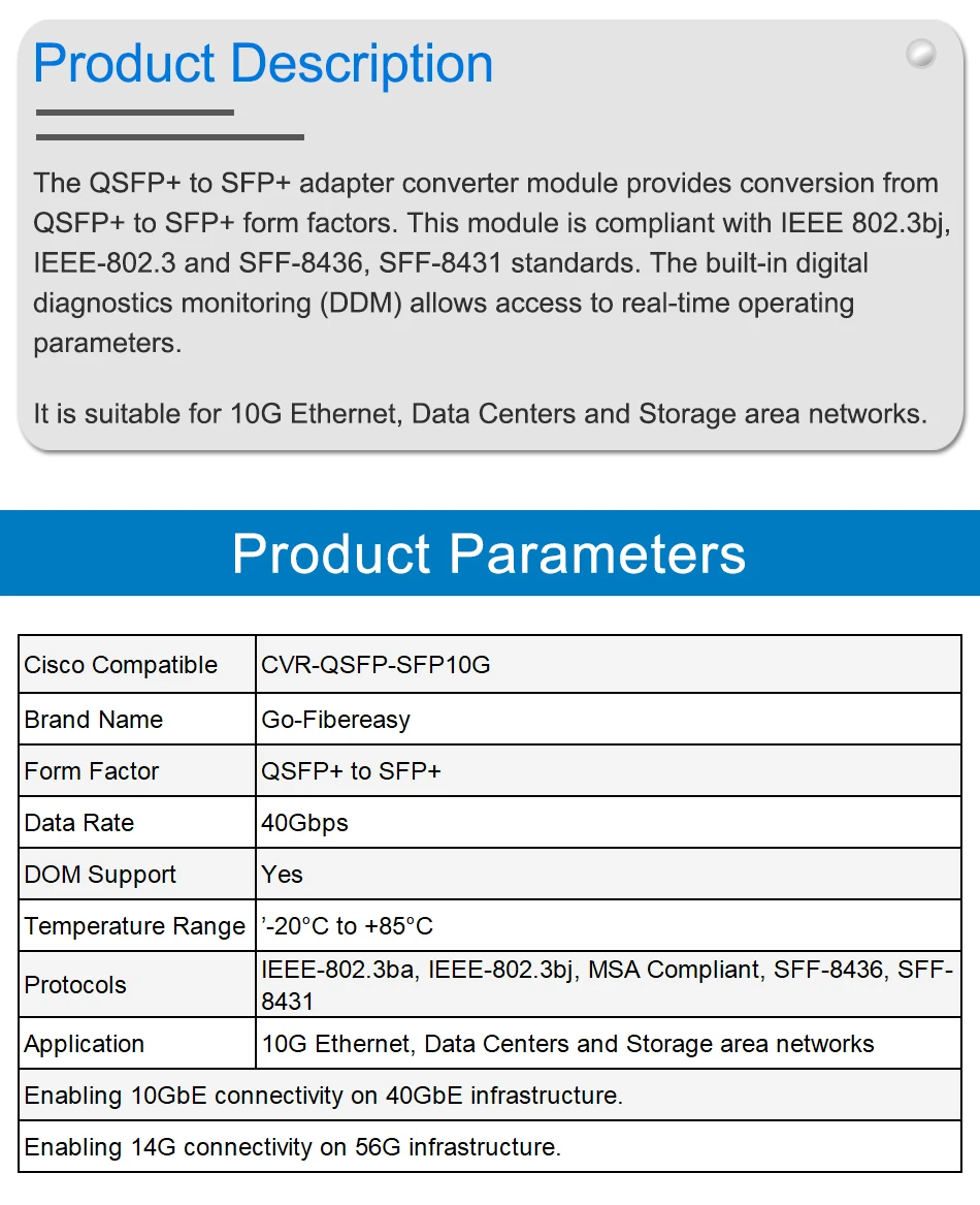 El módulo convertidor adaptador QSFP + A SFP + proporciona la conversión de factores de forma QSFP + A SFP +. Este módulo cumple con los estándares IEEE 802.3bj, IEEE-802.3 y SFF-8436, SFF-8431. El monitoreo de diagnóstico digital integrado (DDM) permite el acceso a parámetros de funcionamiento en tiempo real. Es adecuado para Ethernet 10G, centros de datos y redes de área de almacenamiento.