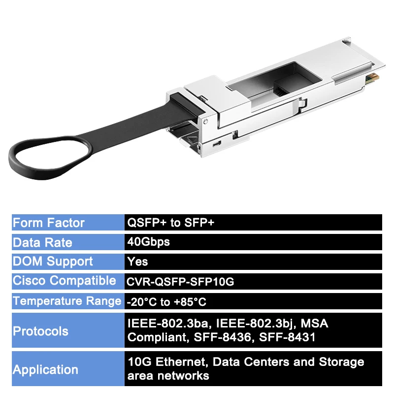 El módulo convertidor adaptador QSFP + A SFP + proporciona la conversión de factores de forma QSFP + A SFP +. Este módulo cumple con los estándares IEEE 802.3bj, IEEE-802.3 y SFF-8436, SFF-8431. El monitoreo de diagnóstico digital integrado (DDM) permite el acceso a parámetros de funcionamiento en tiempo real. Es adecuado para Ethernet 10G, centros de datos y redes de área de almacenamiento.
