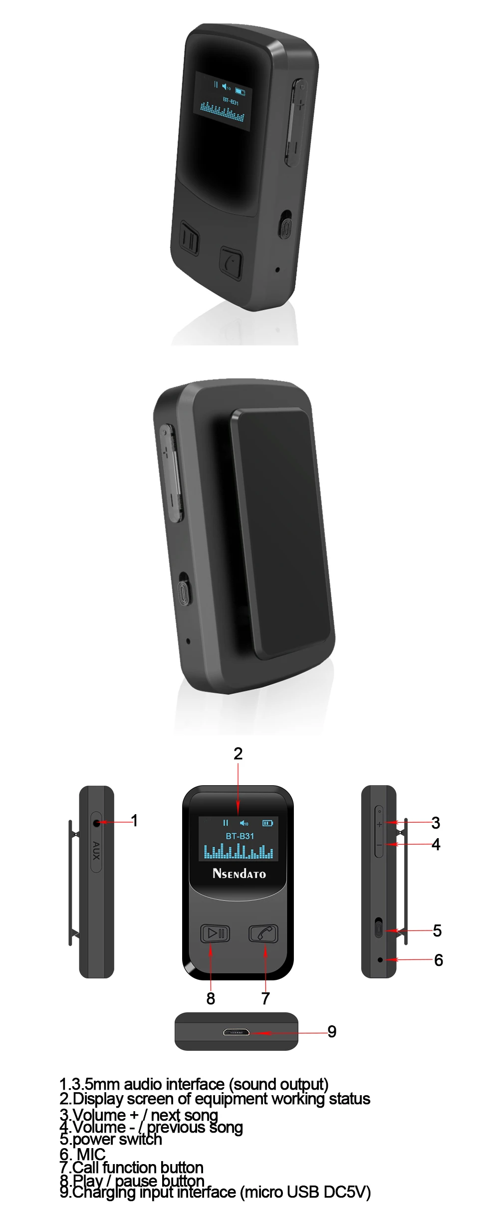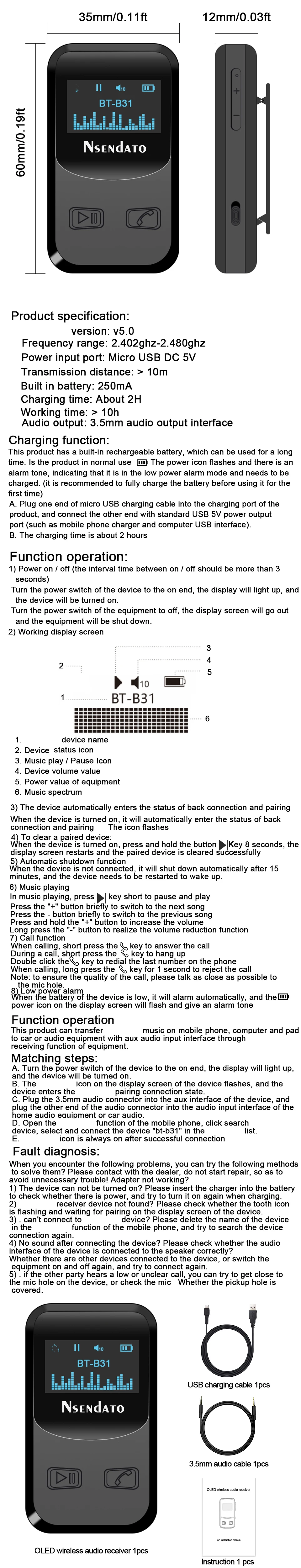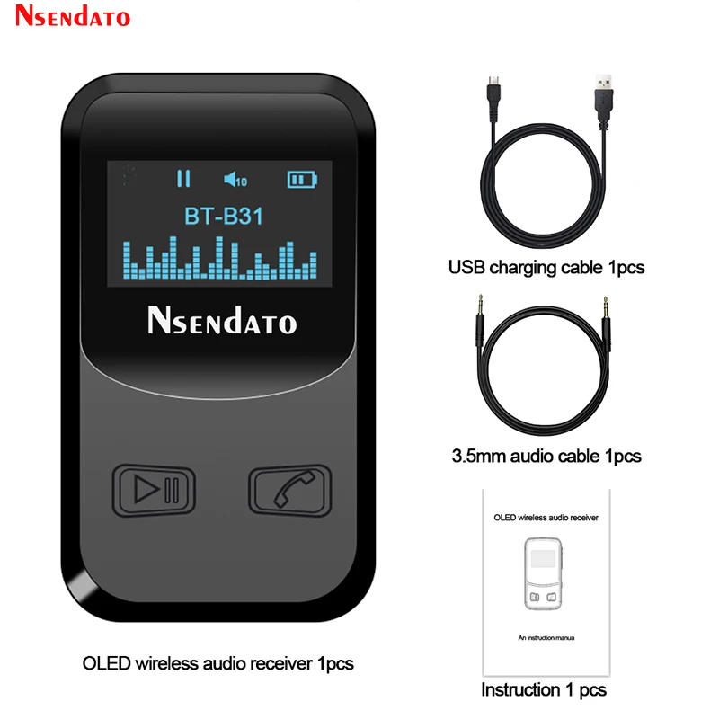 Modelo: Nsendato B31 Tipo: Receptor inalámbrico BT V5.0 Color negro Versión: 5,0 Micrófono incorporado: cancelación de ruido DSP+CVC8.0 Tiempo de carga: 2,5 horas Tiempo de juego: 12 horas Distancia de conexión: 40 pies/12 m Puerto AUX del coche compatible: Sí