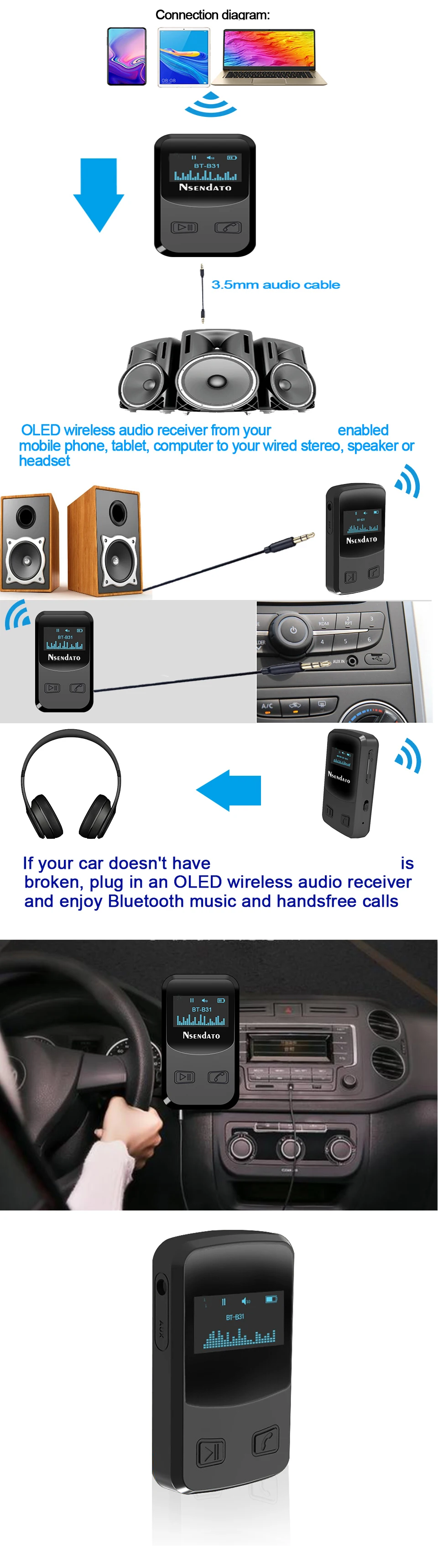 NUEVO DISEÑOHa llegado el primer receptor de audio inalámbrico con pantalla OLED.Puede tener toda la información del estado de la transmisión inalámbrica desde un simple vistazo en la pantalla.Muestra el estado de la conexión inalámbrica, la batería, el volumen y el ID de la persona que llama, etc.* CALZAS CLARAS DE CRISTALNsendato hace todo lo posible para ofrecer la mejor experiencia de llamadas manos libres mediante el uso de tecnología de cancelación de ruido dual.El receptor de audio tiene un software de cancelación de ruido DSP y CVC8.0 instalado, lo que garantiza una escucha clara y una transmisión de voz auténtica.* TIRO INALÁMBRICO 12HSe almacenan 12 horas de reproducción en el receptor de audio Nsendato de bolsillo para una transmisión de música continuamente inalámbrica.Nsendato también garantiza la seguridad de utilizar el adaptador inalámbrico mientras se carga instalando una batería de litio de alta eficiencia.* CONEXIÓN INALÁMBRICA CONFIABLETransmita de forma inalámbrica sus canciones favoritas con la tecnología BT V5.0 rápida y estable.El emparejamiento fácil y fluido con diferentes dispositivos es ininterrumpido dentro de un rango de hasta 40 pies, lo que permite disfrutar de audio gratuito y sin interrupciones.* SONIDO SURRONO 3DEl receptor de música inalámbrico Nsendato proporciona una experiencia de audio inalámbrica de alta fidelidad con un chip CSR incorporado que admite profiles AVRCP, A2DP, HFP y HSP.Si prefiere graves ricos y sonido estéreo, simplemente presione los botones "+" y "-" para activar los efectos de sonido envolvente. Paquete incluido:1 * Adaptador de transmisor/receptor de audio inalámbrico 5.01 * Cable de alimentación micro USB
