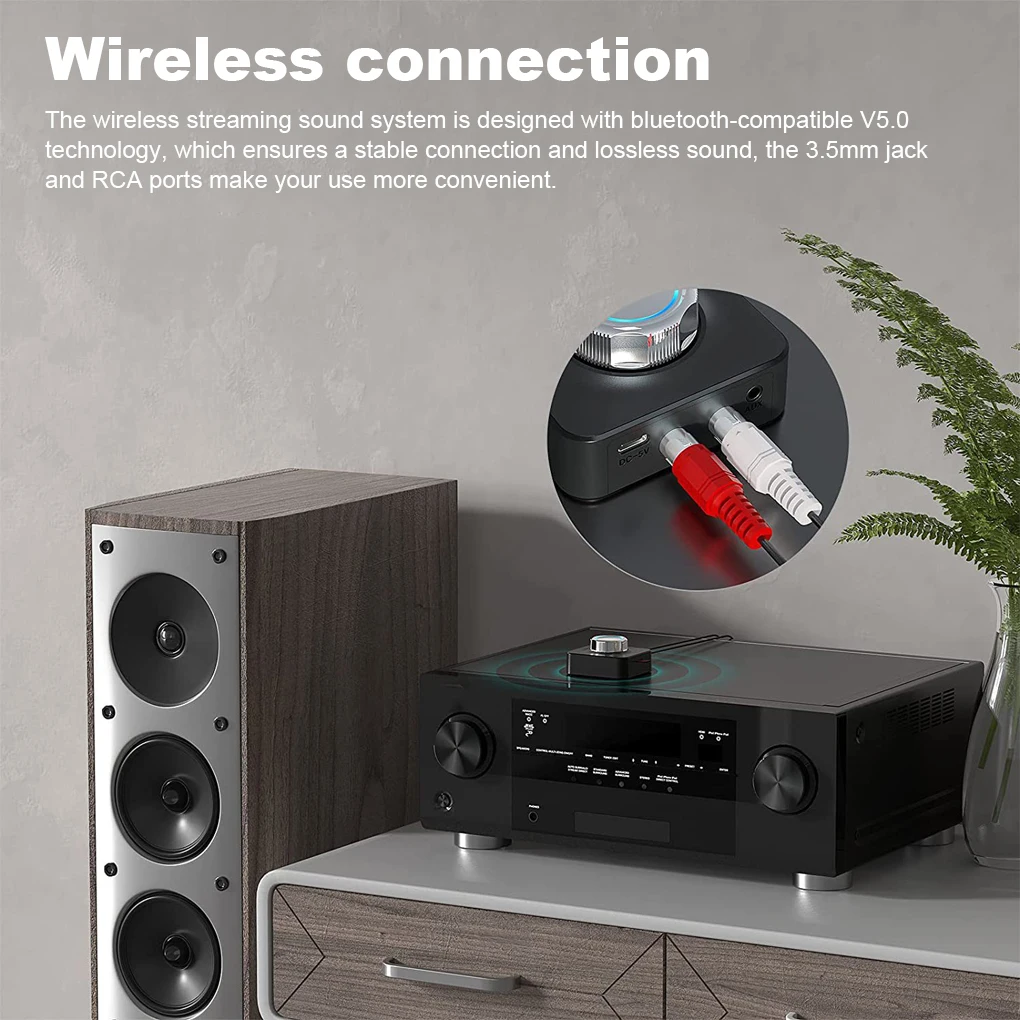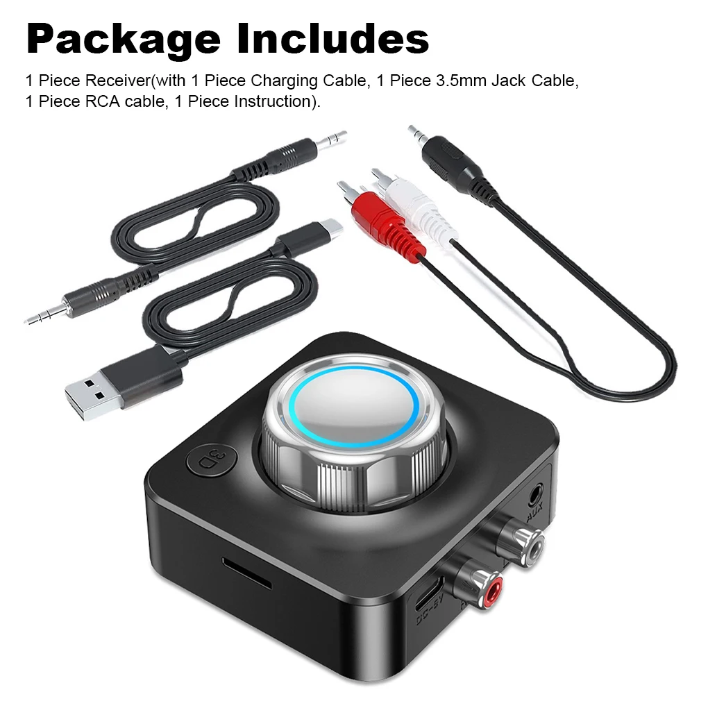 Función: puede conectar este receptor compatible con Bluetooth al altavoz del automóvil, cine en casa, auriculares con cable, altavoz, amplificador y otros dispositivos, lo que le ayuda a disfrutar de un sonido estéreo HiFi streaming.Fácil funcionamiento: este receptor de música inalámbrico funciona con tecnología de encendido y emparejamiento automático, conectará sus dispositivos automáticamente cuando se encienda y admite la conexión de 2 dispositivos a la vez.Conexión inalámbrica: el sistema de transmisión de sonido inalámbrico está diseñado con tecnología V5.0 compatible con Bluetooth, que garantiza una conexión estable y un sonido sin pérdidas, el conector de 3,5mm y los puertos RCA hacen que su uso sea más conveniente.Ajuste: puede ajustar el volumen y la música según sus necesidades, y la tecla multifuncional satisface sus diferentes necesidades, admite TF y reproducción de tarjeta de memoria, emparejando su teléfono inteligente y tableta al mismo tiempo.Portátil: diseñado con un tamaño pequeño y ligero, este adaptador se puede llevar fácilmente sin ocupar mucho espacio, y tiene un conector AUX de 3,5mm y 2 puertos RCA, adecuado para el hogar, oficina, hotel y otros lugares.Especificación: