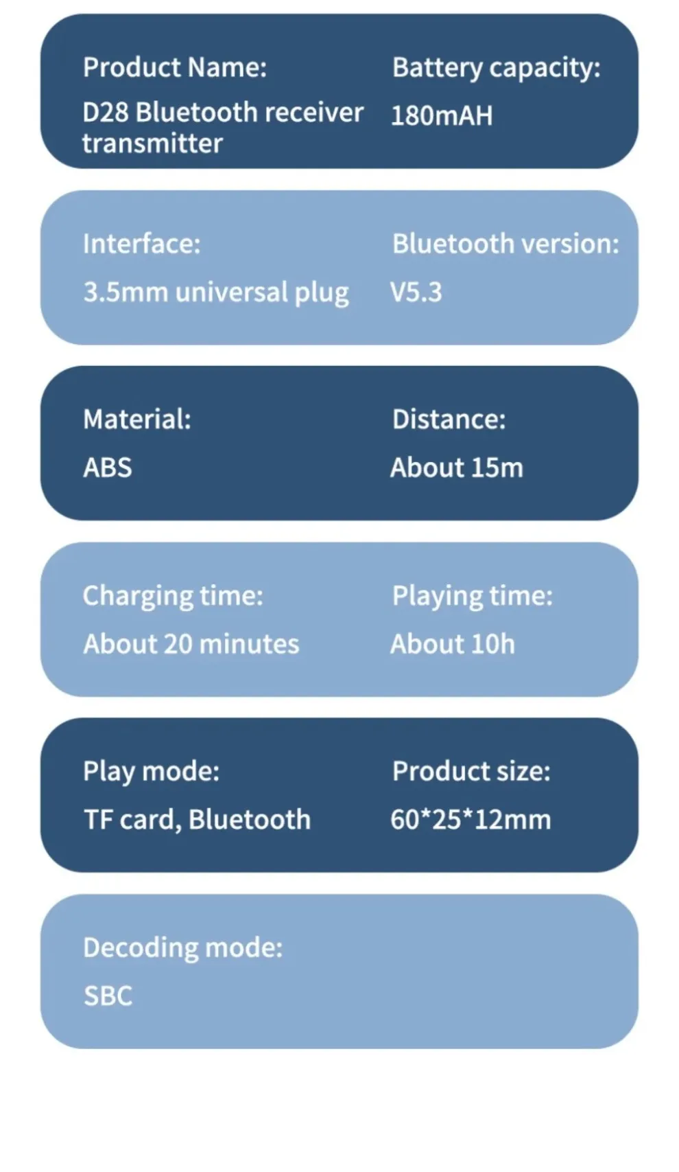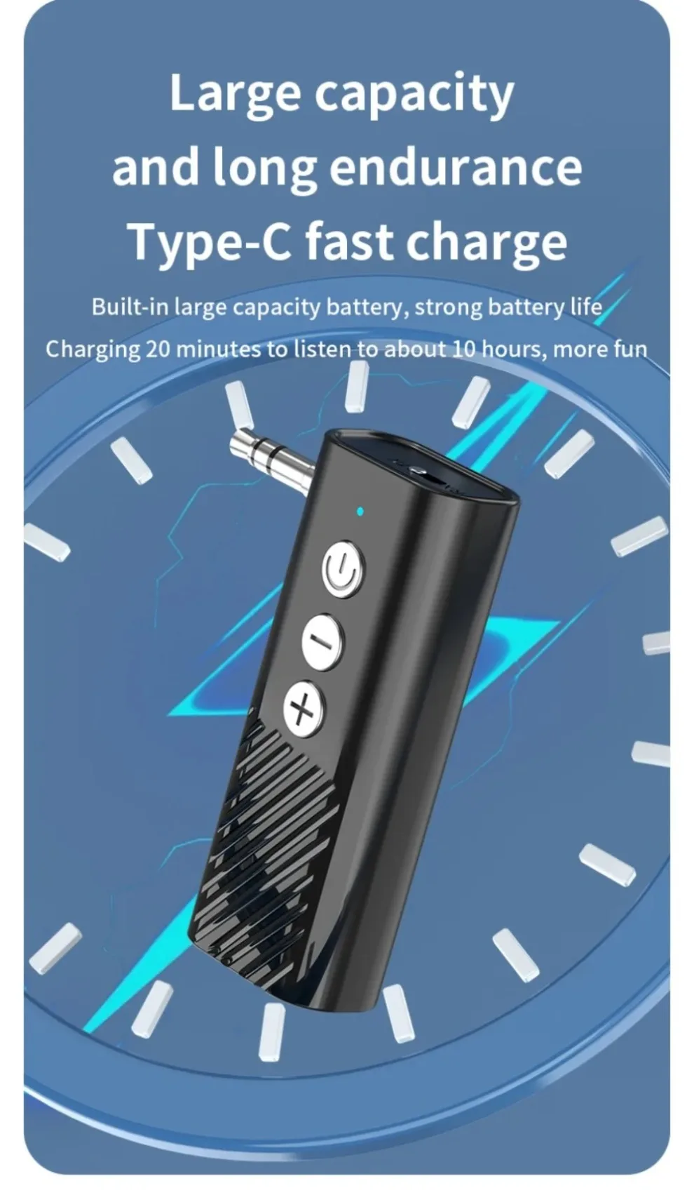 2.Carga rápida tipo C: adaptador AUX equipado con una batería de gran capacidad para un uso prolongado. Una carga rápida de 20 minutos permite hasta 10 horas de reproducción de música, lo que garantiza que disfrutes de tu música al máximo.