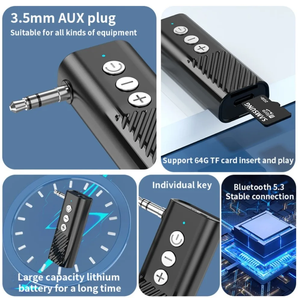 4.Plug and Play: Admite tarjetas TF de hasta 64GB para una reproducción inmediata. El adaptador de audio estéreo también admite Transmisión de navegación en modo receptor y llamadas manos libres, lo que aumenta su comodidad.