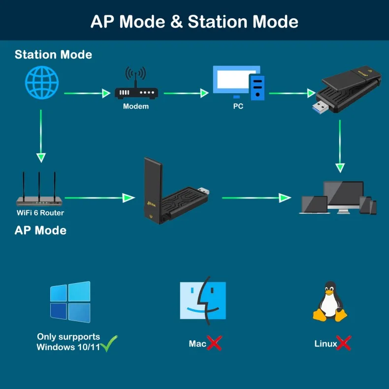 Adaptador WiFi USB de doble banda AX1800: El adaptador WiFi admite banda dual 2,4G 2T2R y 5,8G 2T2R, velocidad de transmisión de hasta 1800Mbps (574Mbps + 1201Mbps), distancia de comunicación efectiva de 100 metros, el mejor rango de distancia dentro de 30 metros. Las velocidades de WiFi pueden alcanzar hasta ≤ 574Mbps en la banda de 2,4 GHz y ≤ 1201Mbps en la banda de 5GHz. Compatible con sistemas Windows 10/11.
