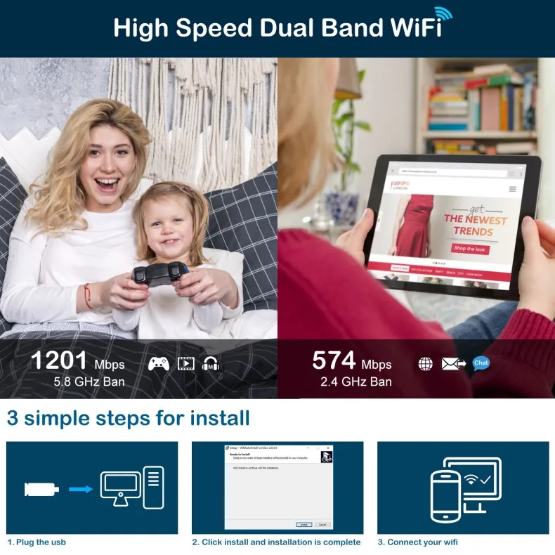 Unidad Dongle Wifi Gratis: Conexión USB 3,0 de alta velocidad (compatible con USB 2,0) con unidad libre y plug and play. Adecuado para la conexión inalámbrica de PC de escritorio y otros dispositivos, y puede proporcionar un acceso inalámbrico a Internet conveniente y rápido. Solo se necesitan tres sencillos pasos para usar en un nuevo dispositivo (1/El USB Conecte; 2/Haga clic en instalar y la instalación estará completa; 3/Conecte su WiFi). El cuerpo del adaptador de red USB es delicado y pequeño, fácil de llevar.