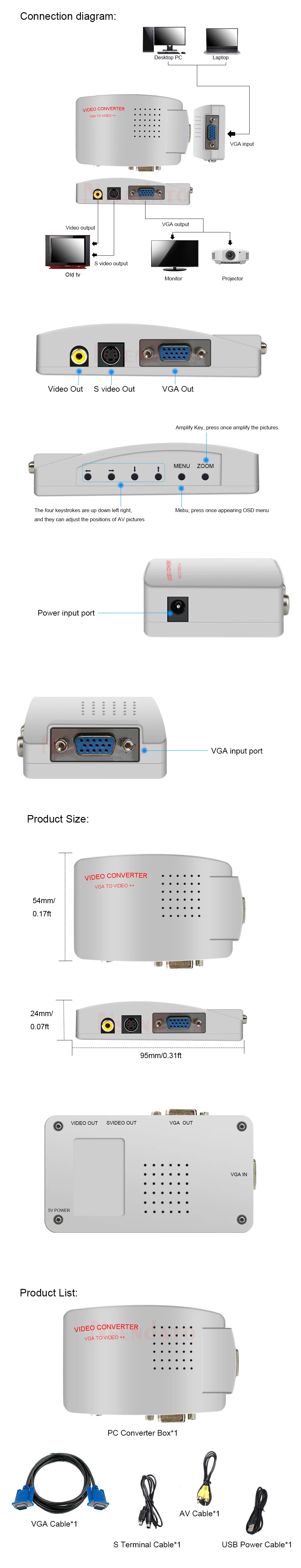 Características:1. Admite salida de vídeo compuesto, S-VIDEO, RGB (opcional).2. Alimentación para PS/2 o puerto USB. Soporte 640X480 @ 60/72/75/85Hz 800x600 @ 60/72/75/85Hz 1024x768 @ 60/70/75/85Hz 1280x1024 @ 60 modo pantalla3. En la pantalla (OSD) estado de operación, Zoom, tamaño.4. Tamaño horizontal independiente y ajuste de tamaño vertical, escalado 2D programable.5. Diseño de hardware puro, solo Plug & Display. No requiere controlador de software, compatible con cualquier sistema operativo.6. Cambiar NTSC, NTSC-EIAJ (para Japón), PAL, PAL-M, PAL-N, ap-combination-N y SECAM (a través de RGB OUT) sistema de vídeo.7. La salida RGB (cable opcional necesario) es compatible con el formato.8. Admite control de posición, ZOOM y botón de menú.9. El botón de menú admite Ajuste de color de fondo HSIZE, VSIZE, brillo, contraste, tono, saturación, nitidez y OSD.10. Visualización simultánea en monitor VGA y TV.11,24 bit, digitalizador de color verdadero.Nota:Puede haber una diferencia de 1-3mm debido a la medición manual.Debido a la pantalla diferente y a la luz diferente, la imagen puede no reflejar el color real del artículo. Gracias por su comprensión.Paquete:1 x caja convertidora1 x Cable VGA1 x Cable de alimentación USB1 x Cable AV1 x Manual del usuario