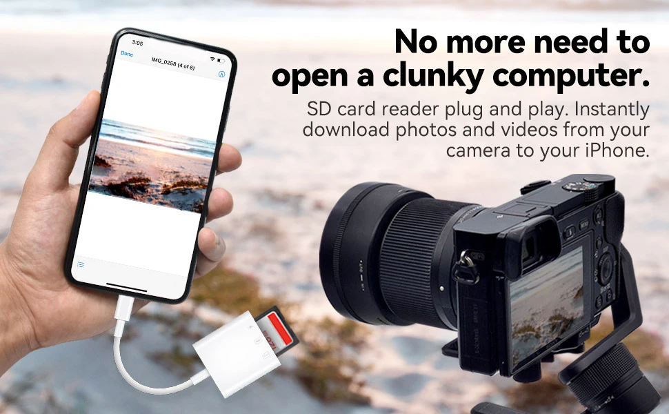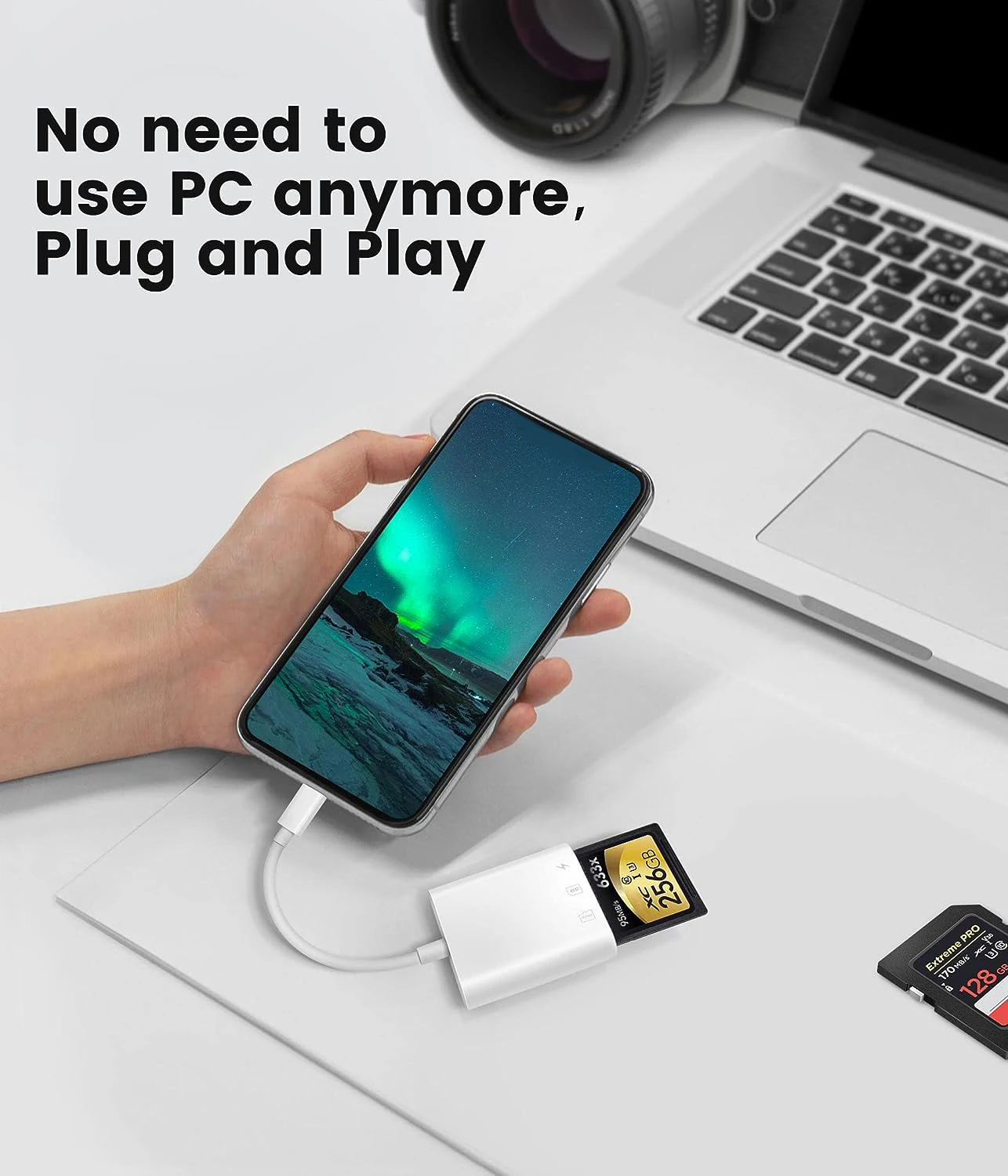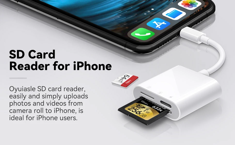 El lector de tarjetas SD, carga fácil y sencilla fotos y vídeos desde el rollo de la cámara hasta el iPhone, es ideal para usuarios de iPhone.