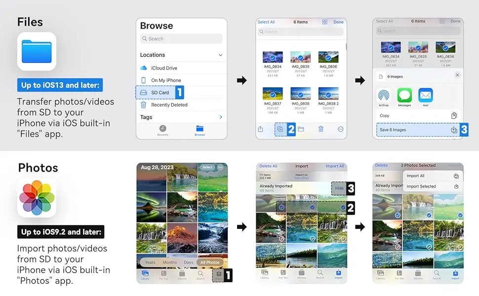Reproducir y reproducir: el lector de tarjetas SD no requiere aplicaciones de terceros, utiliza la aplicación de archivos integrados en iOS y admite la reproducción de videos.