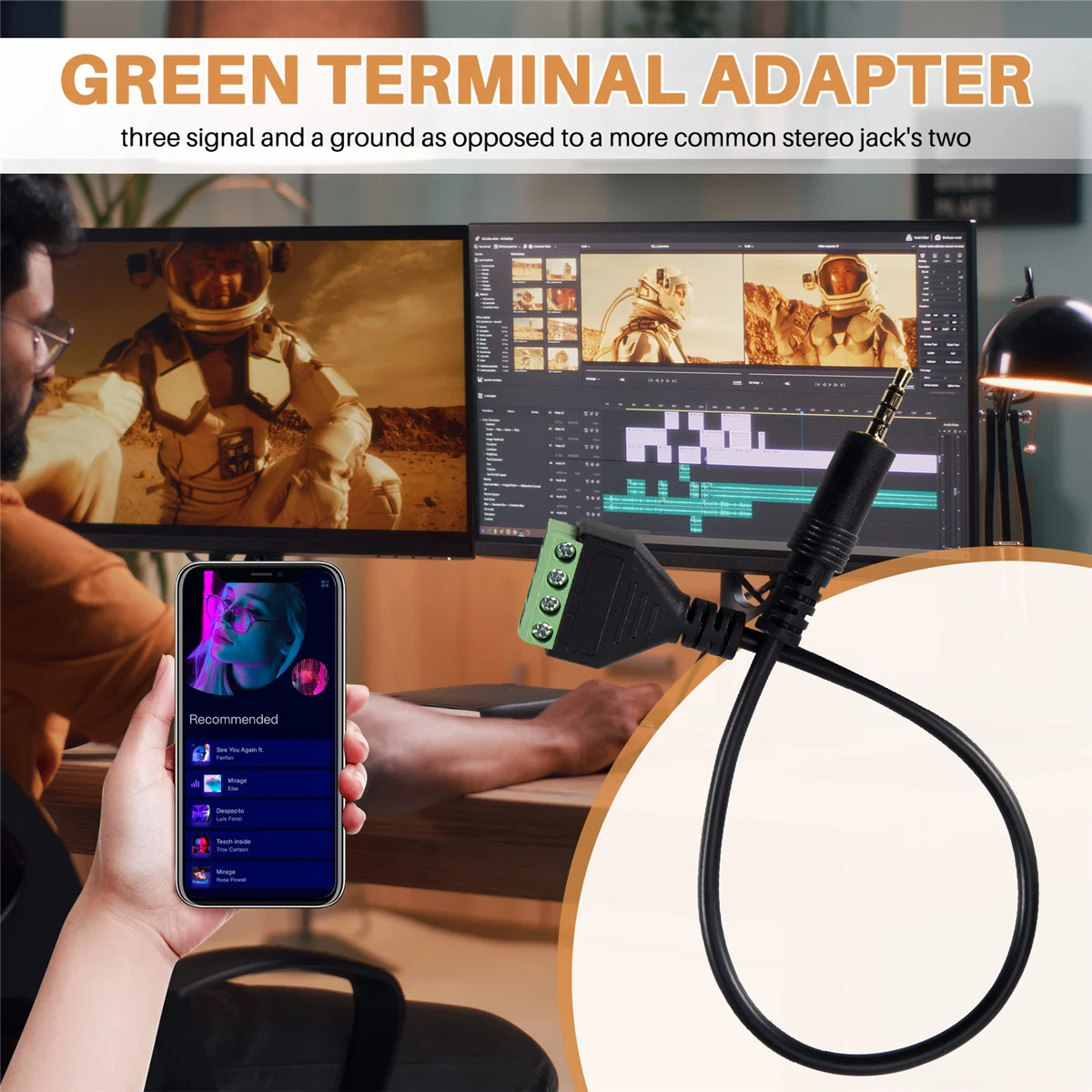 2. Cable de bloque de terminales de tornillo de 3,5mm que conecta cables individuales con cabezales de cable abiertos a su conector de 3,5mm.