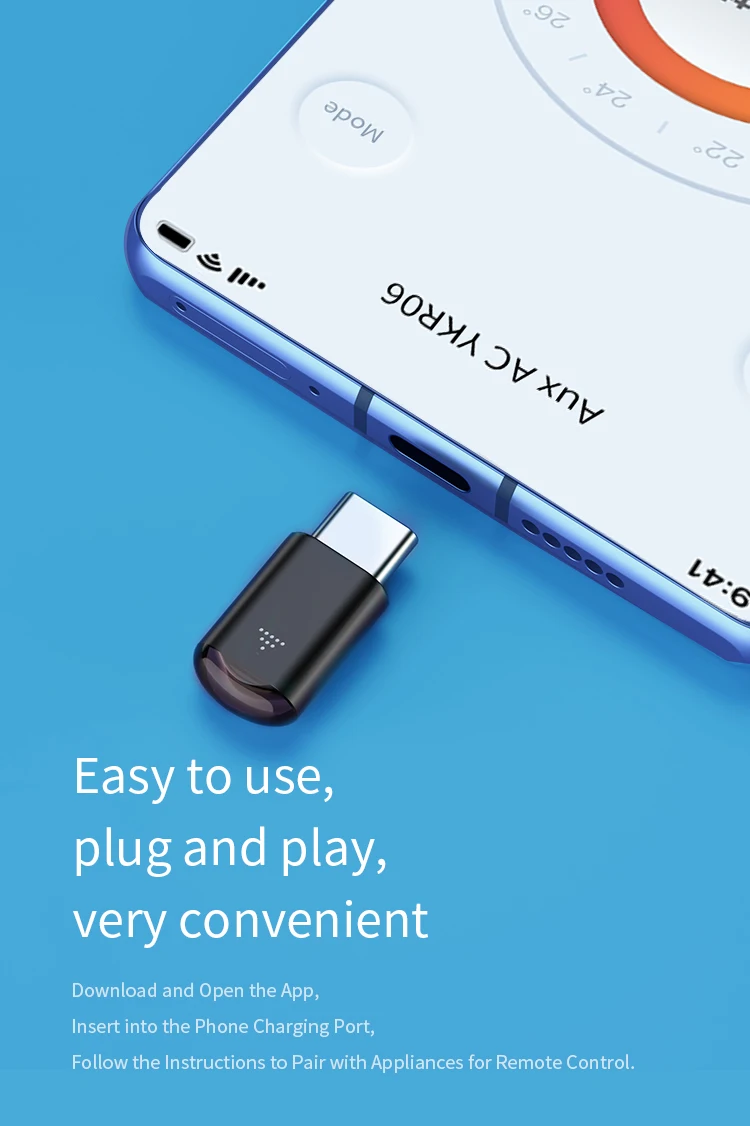 Inserte el control remoto en el puerto del teléfono móvil, abra la APLICACIÓN y apunte al electrodoméstico para que coincida, luego podrá controlarlo de forma remota. Nota: No apague la función de rotación del teléfono móvil, de lo contrario la interfaz del control remoto en la APLICACIÓN no podrá girar.