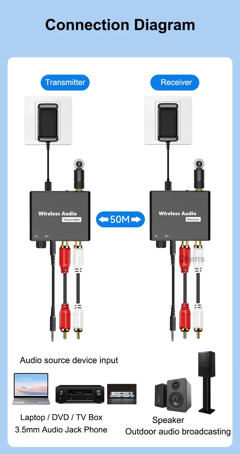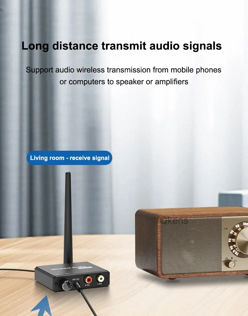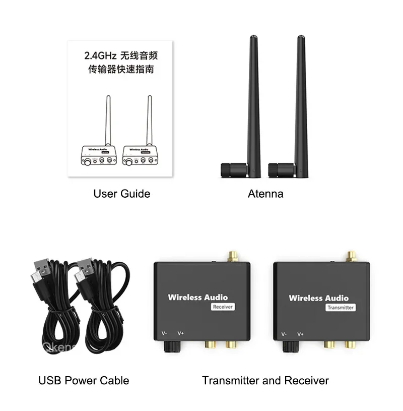 This product is a wireless audio transmitter and receiver, using 2.4G technology for HD sound quality
