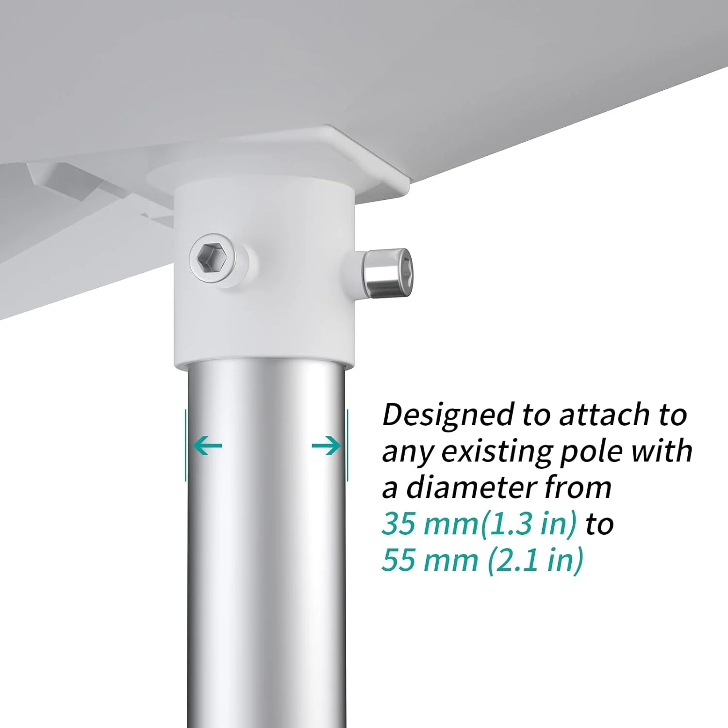 Compatibilidad de polos: el adaptador de tubería Starlink Gen 3 está diseñado para conectarse a cualquier poste existente con un diámetro mínimo de 35 mm (1,3 pulgadas) y un diámetro máximo de 55 mm (2,1 pulgadas)