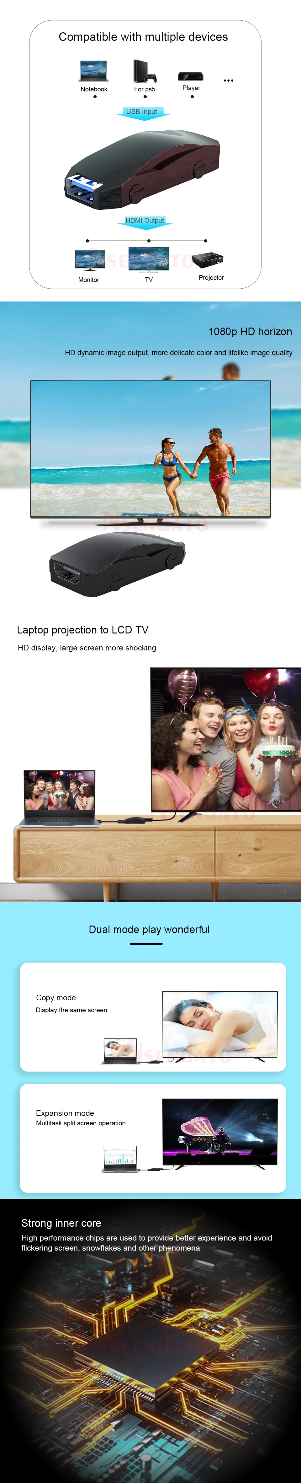 Este convertidor USB a HDMI puede mostrar o ampliar la imagen de PC/teléfono inteligente/.