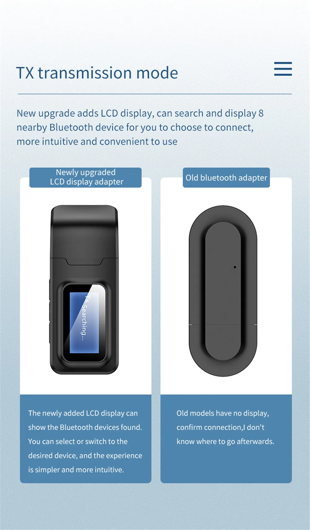 1. Nuevo diseño: ha llegado el primer receptor Bluetooth con pantalla LCD. Puede tener toda la información del estado de la transmisión inalámbrica desde un simple vistazo a la pantalla. Muestra el estado de la conexión Bluetooth.
