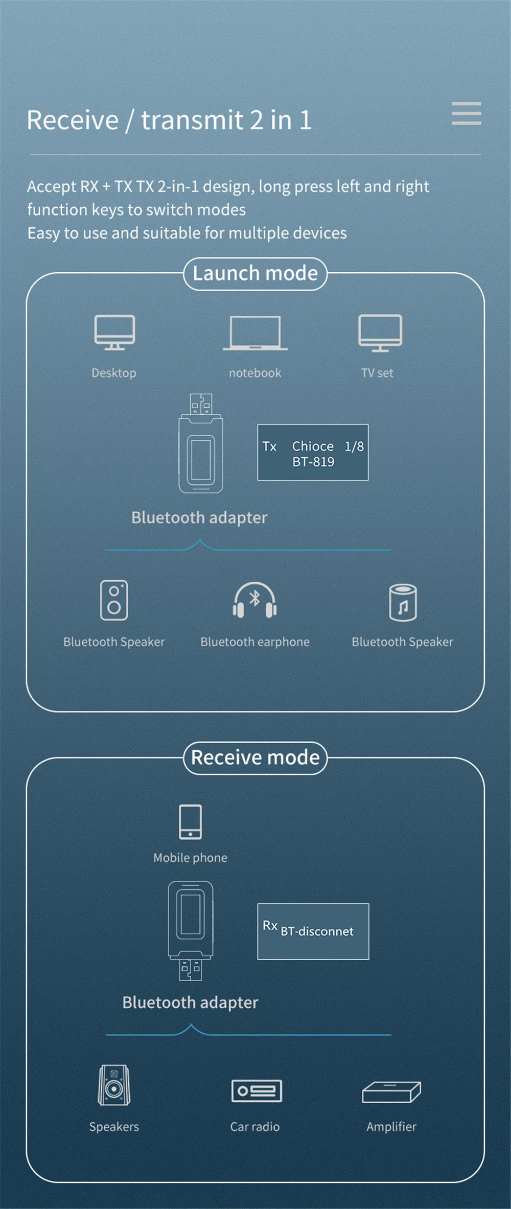 4. MODO DE RECEPCIÓN DEL TRANSMISOR: con diseño 2 en 1, usando este adaptador inalámbrico puedes enviar y recibir todo el audio libre y fácilmente. El transmisor permite que su TV, receptor AV, radio y otros dispositivos de fuente de audio domésticos transmitan música a sus auriculares o altavoces Bluetooth; el receptor permite a dispositivos sin Bluetooth como su estéreo doméstico o receptor AV transmitir música de forma inalámbrica desde su teléfono móvil/PC.