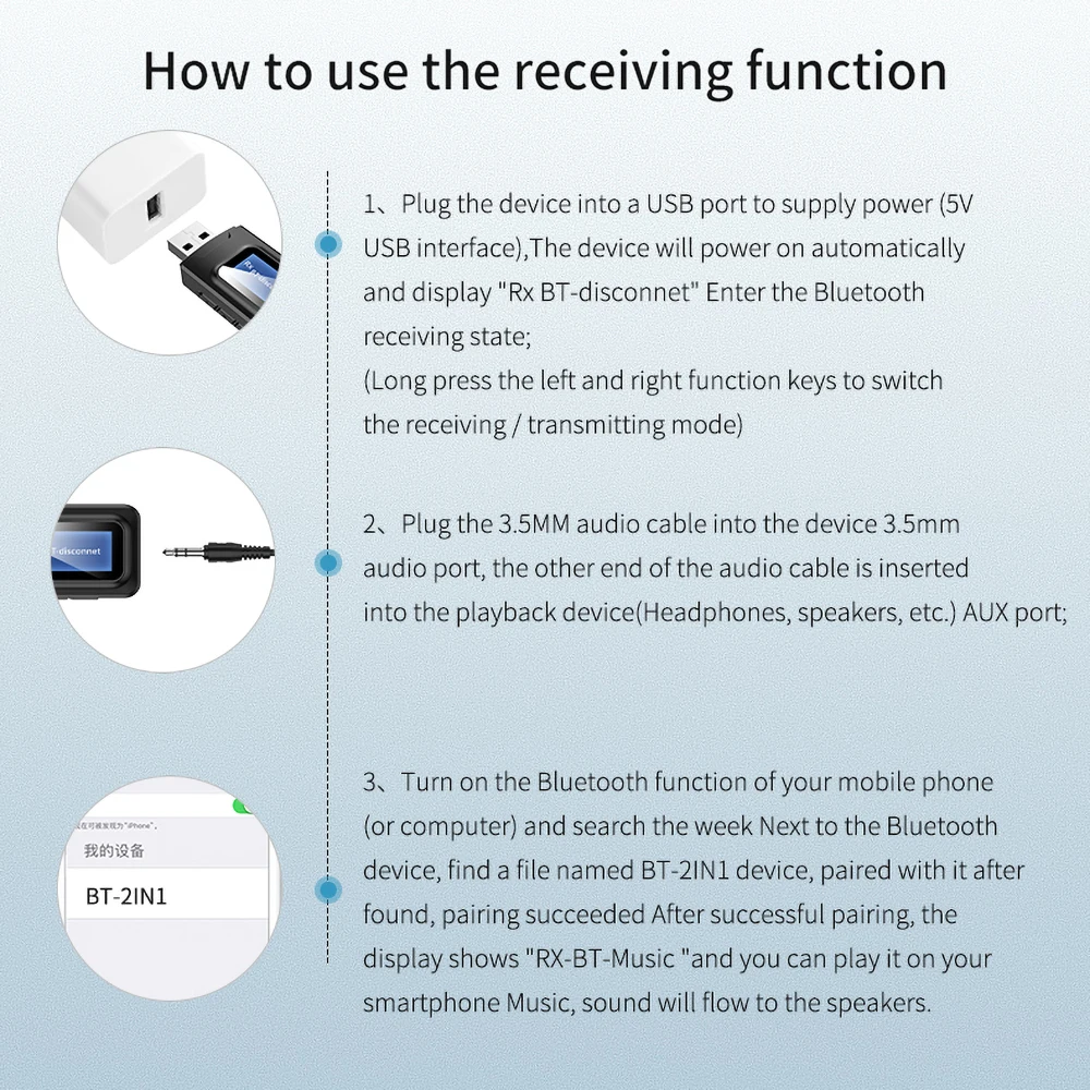 4. MODO DE RECEPCIÓN DEL TRANSMISOR: con diseño 2 en 1, usando este adaptador inalámbrico puedes enviar y recibir todo el audio libre y fácilmente. El transmisor permite que su TV, receptor AV, radio y otros dispositivos de fuente de audio domésticos transmitan música a sus auriculares o altavoces Bluetooth; el receptor permite a dispositivos sin Bluetooth como su estéreo doméstico o receptor AV transmitir música de forma inalámbrica desde su teléfono móvil/PC.