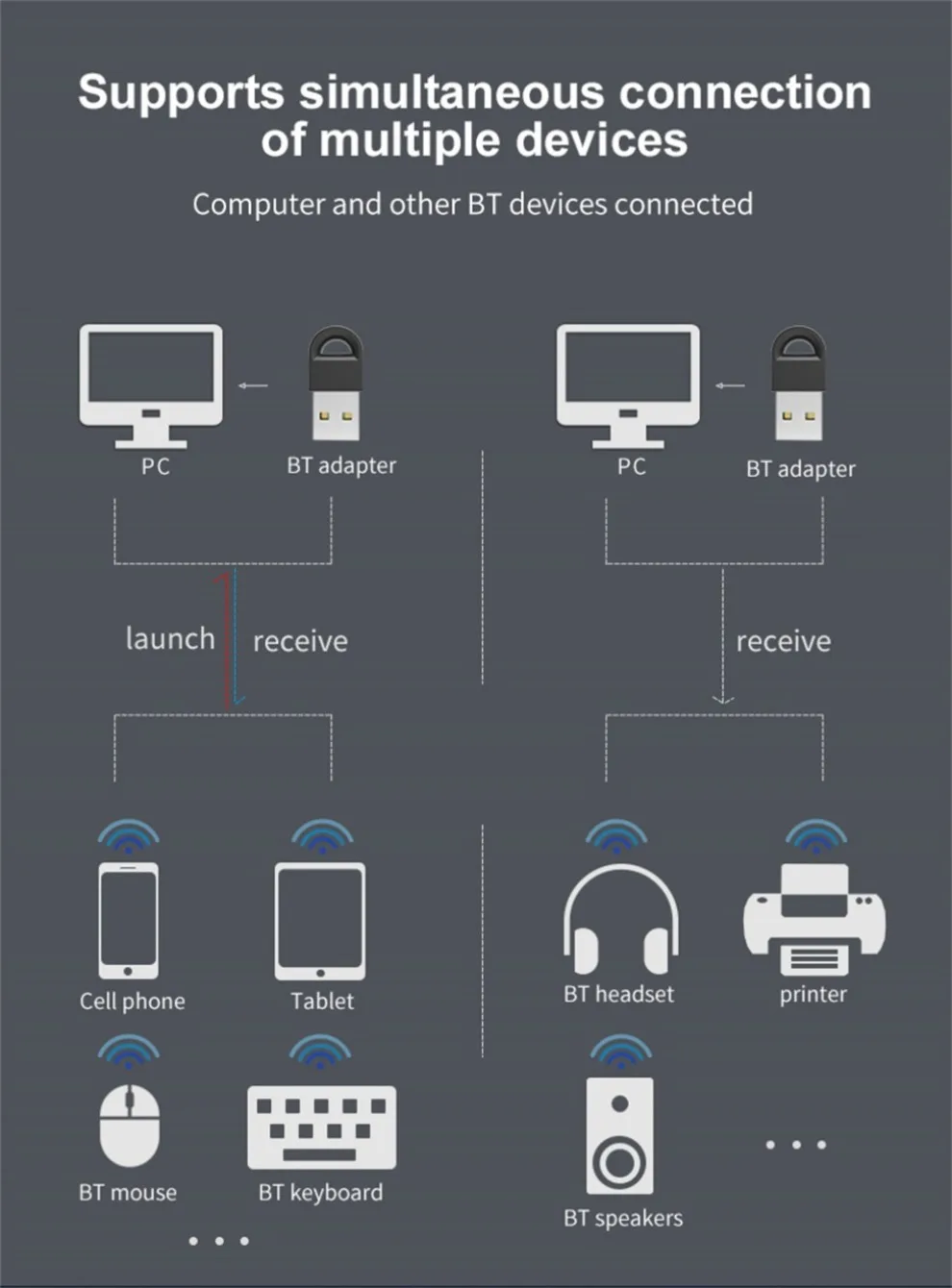 Especificación:Win8 o superior no requiere controlador y puede conectar 8 dispositivos Bluetooth.