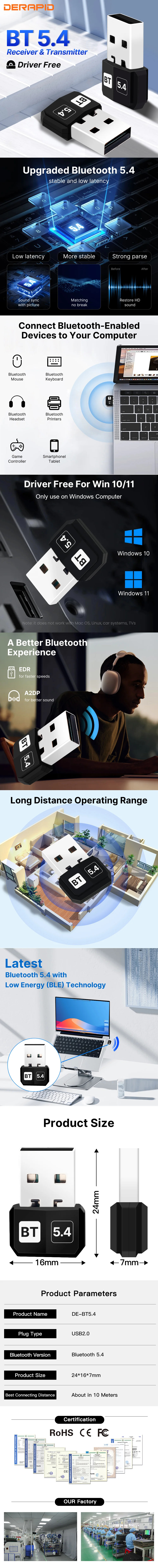 Comprar Adaptador USB Bluetooth 5,4, receptor y transmisor inalámbrico, Dongle de Audio, para Win10/11, SIN controlador