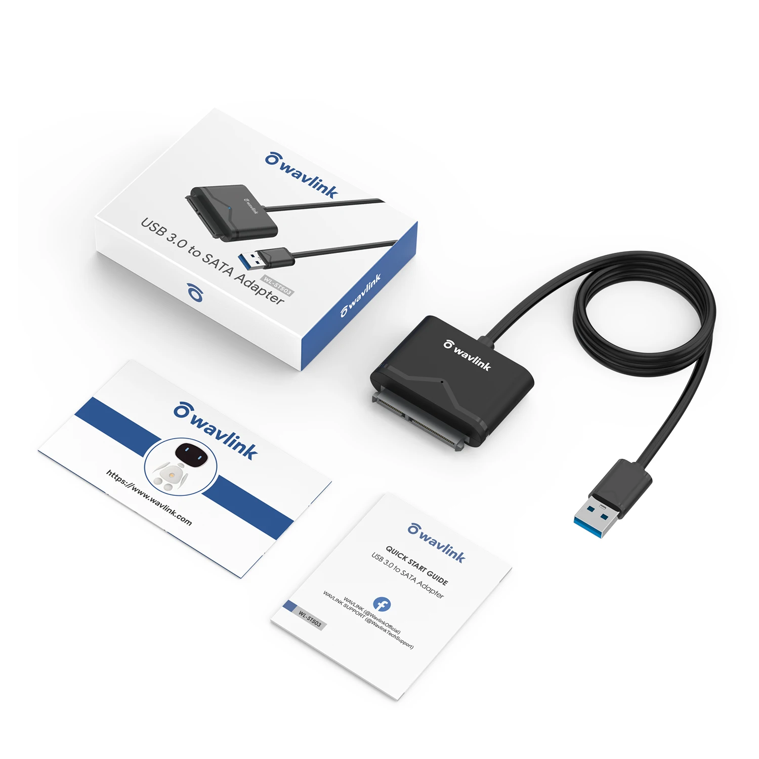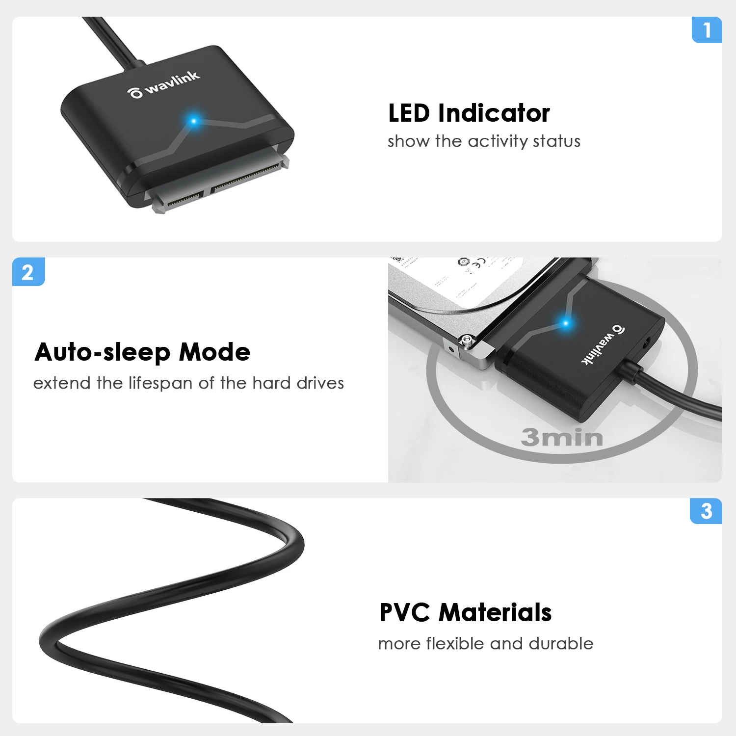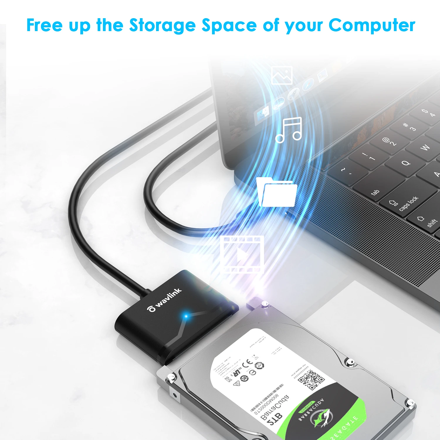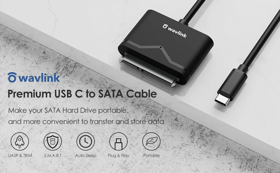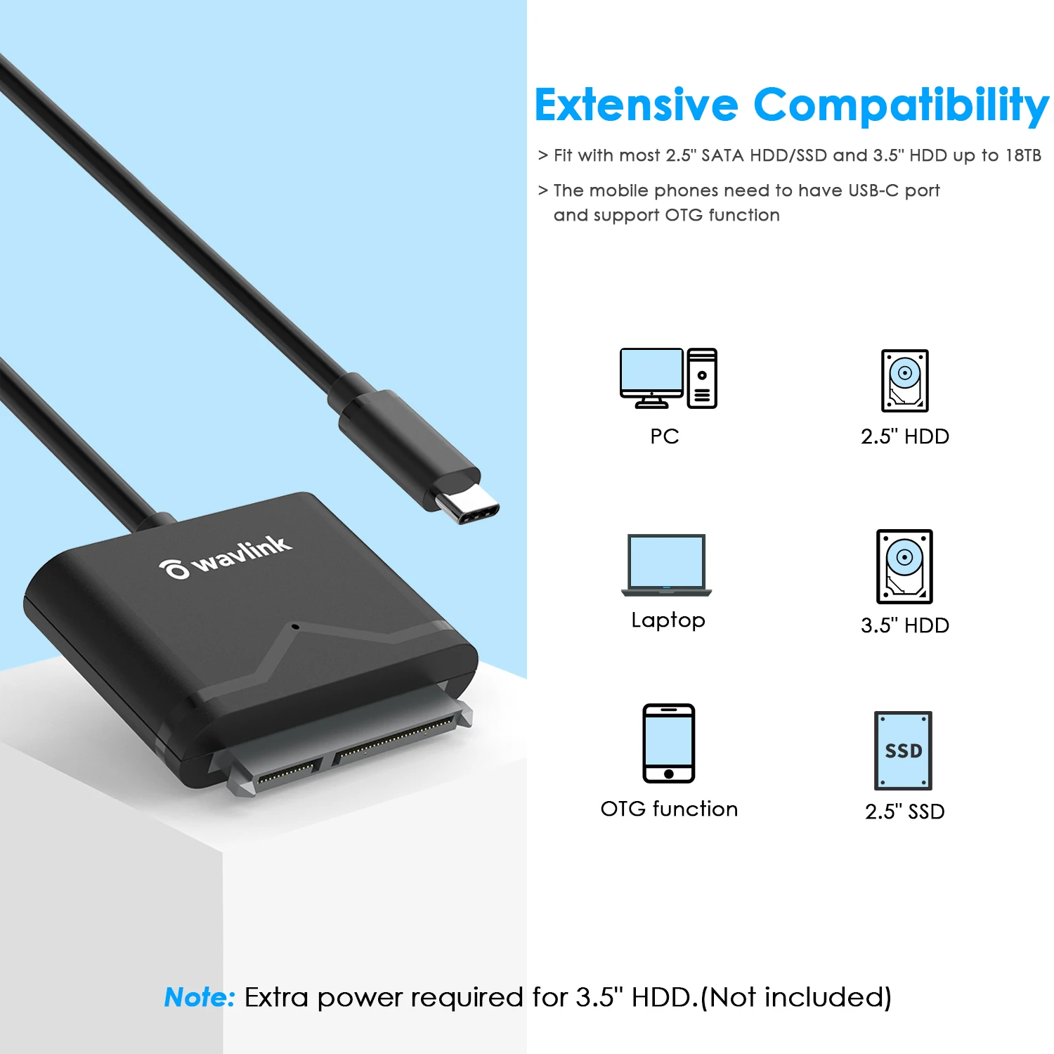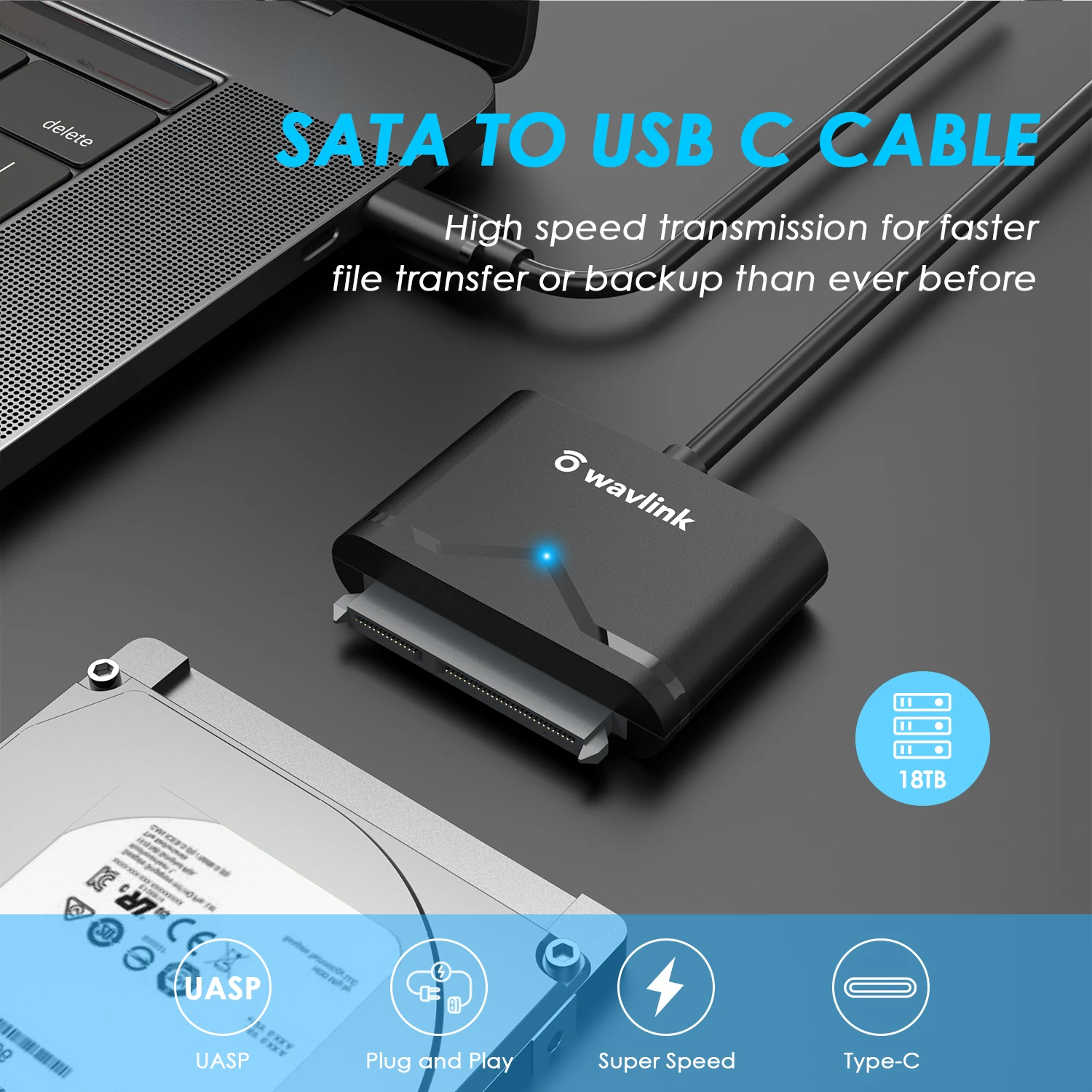 Cable adaptador WAVLINK SATA a USB C con cable flexible de 50cm-Conector de disco duro externo SATA III para transferencia de datos SSD/HDD de 2,5 ''y HDD de 3,5", compatible con UASP, TRIM y S.M.A.R.T. con 3 minutos de suspensión automática, convertidor máximo de 18TB USB 3,0 a disco duro SATAEspecificación:-Soporta 2,5 "SSD/HDD y 3,5" HDD hasta 18TB.-La velocidad máxima de transferencia de datos es de alrededor de 5Gbps.-Compatible con versiones anteriores de puertos USB (1,1 y 2,0).-Admite el protocolo de aceleración UASP y TRIM, optimiza la utilización de la CPU, reduce mucho el tiempo de transmisión.-Compatible con SATA revisión I/II/III, la velocidad de transmisión real depende de la capacidad del HDD/SSD conectado.-Este cable SATA a USB 3,0 está construido con un cable de 50cm que hace que funcione con la caja. No hay necesidad de preocuparse de que el cable se pierda.-Compatible con Windows 10, 8, 8,1, 7, Vista, XP, Mac OS 9, 10, 11 o posterior, Linux, Chrome OS. UASP es un protocolo de transferencia, que requiere que su sistema operativo sea Win 8,Win 8,1, Win 10, MAC OS 8 o superior.Nota importante:Se requiere energía adicional para HDD de 3,5 ", el cable de alimentación no está incluido.Acceda a sus archivos directamente con el teléfono habilitado para OTG, el convertidor de la interfaz de su teléfono no está incluido.No es compatible con las interfaces ATA(IDE), MSATA y M.2. Confirme su tipo de disco duro antes de comprar.El teléfono móvil puede leer el disco con una memoria máxima de 18TB. Los diferentes teléfonos pueden admitir diferentes capacidades.Recordatorio cálido:Por favor, evite el ambiente húmedo.Recuerde quitar de forma segura el disco de su ordenador portátil/PC primero.Por favor, No desmonte este producto sin la ayuda de profesionales.Por favor, no dañe este producto a propósito ni aplaste el dispositivo con fuerza externa.