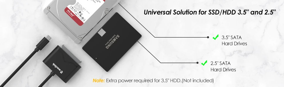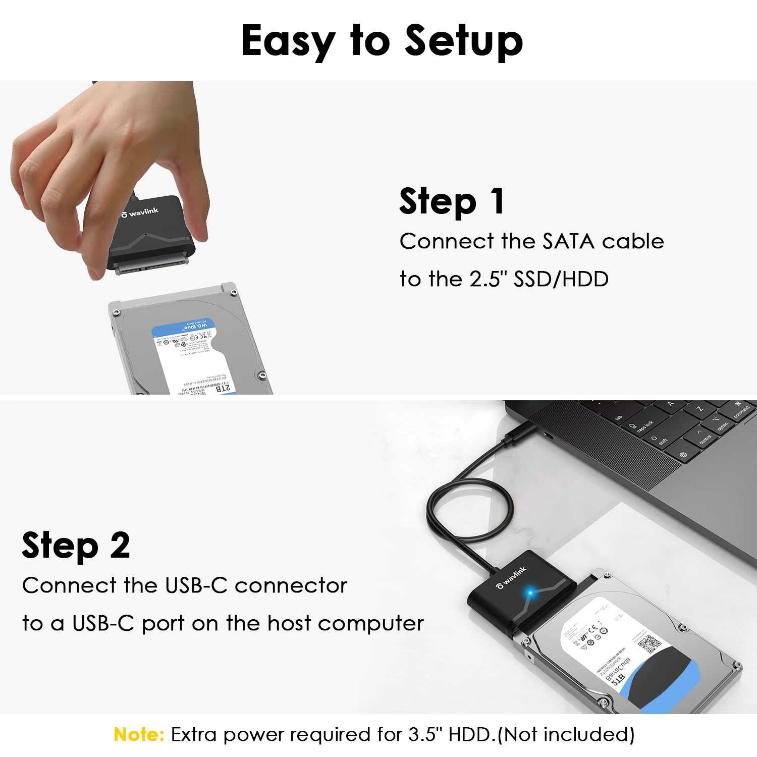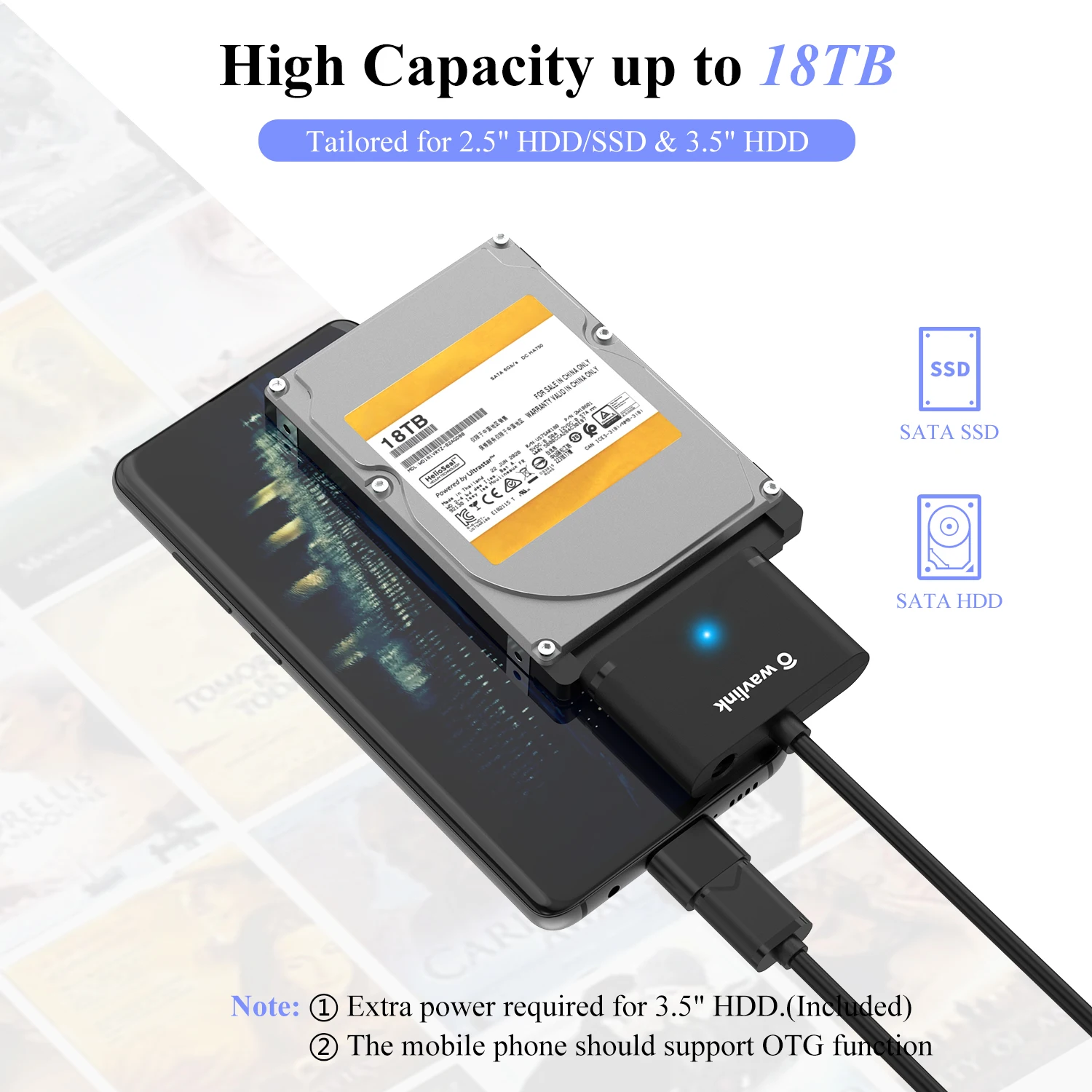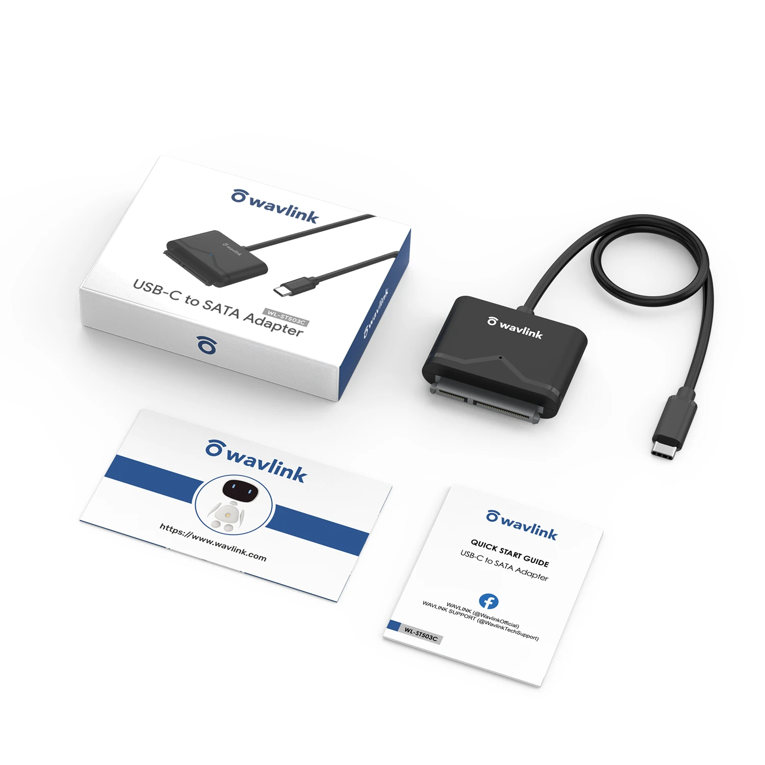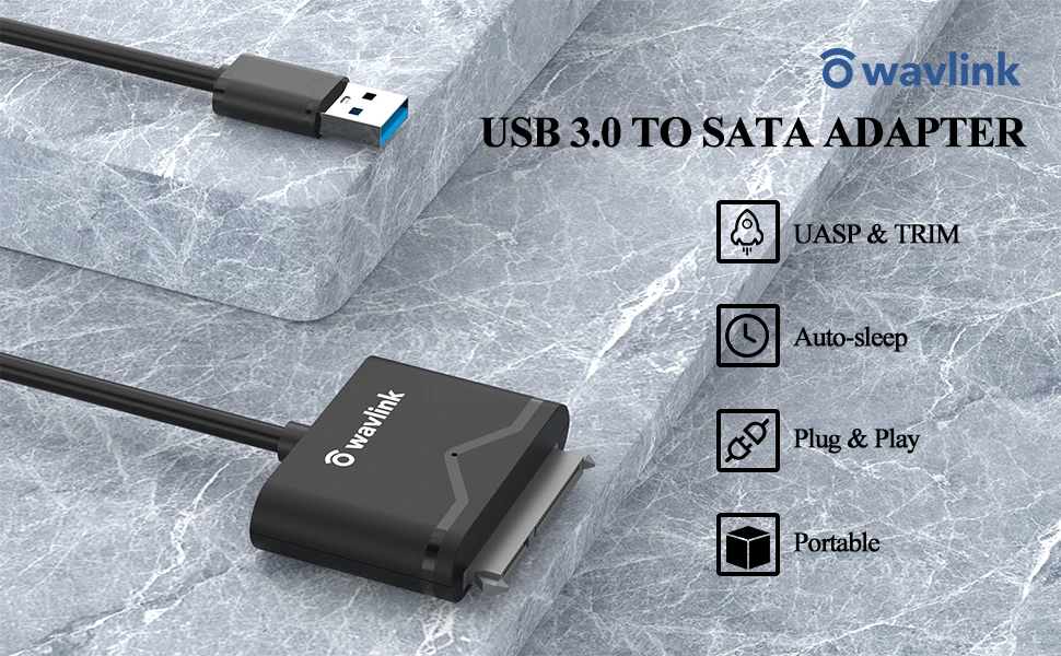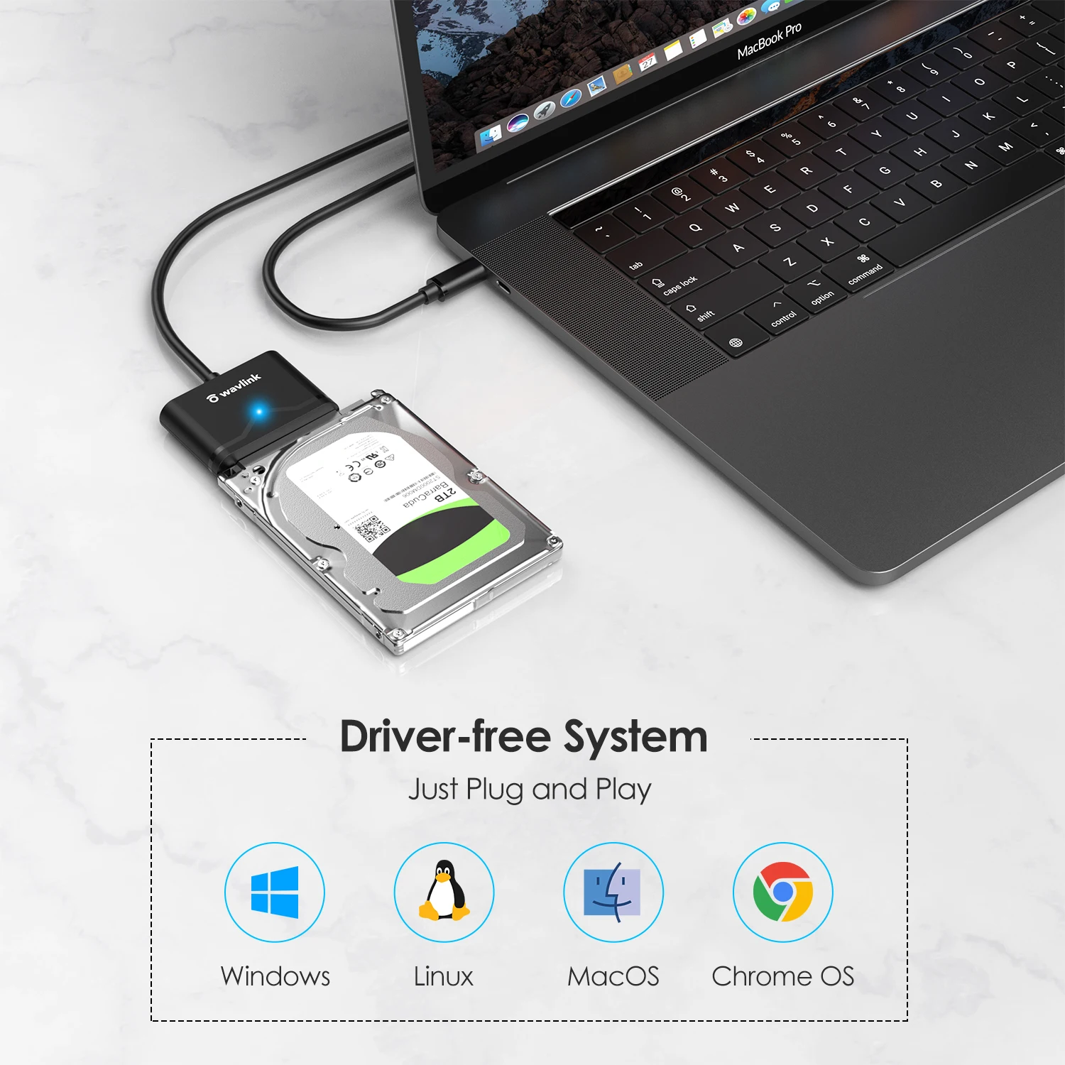Cable adaptador WAVLINK SATA a USB C con cable flexible de 50cm-Conector de disco duro externo SATA III para transferencia de datos SSD/HDD de 2,5 ''y HDD de 3,5", compatible con UASP, TRIM y S.M.A.R.T. con 3 minutos de suspensión automática, convertidor máximo de 18TB USB 3,0 a disco duro SATAEspecificación:-Soporta 2,5 "SSD/HDD y 3,5" HDD hasta 18TB.-La velocidad máxima de transferencia de datos es de alrededor de 5Gbps.-Compatible con versiones anteriores de puertos USB (1,1 y 2,0).-Admite el protocolo de aceleración UASP y TRIM, optimiza la utilización de la CPU, reduce mucho el tiempo de transmisión.-Compatible con SATA revisión I/II/III, la velocidad de transmisión real depende de la capacidad del HDD/SSD conectado.-Este cable SATA a USB 3,0 está construido con un cable de 50cm que hace que funcione con la caja. No hay necesidad de preocuparse de que el cable se pierda.-Compatible con Windows 10, 8, 8,1, 7, Vista, XP, Mac OS 9, 10, 11 o posterior, Linux, Chrome OS. UASP es un protocolo de transferencia, que requiere que su sistema operativo sea Win 8,Win 8,1, Win 10, MAC OS 8 o superior.Nota importante:Se requiere energía adicional para HDD de 3,5 ", el cable de alimentación no está incluido.Acceda a sus archivos directamente con el teléfono habilitado para OTG, el convertidor de la interfaz de su teléfono no está incluido.No es compatible con las interfaces ATA(IDE), MSATA y M.2. Confirme su tipo de disco duro antes de comprar.El teléfono móvil puede leer el disco con una memoria máxima de 18TB. Los diferentes teléfonos pueden admitir diferentes capacidades.Recordatorio cálido:Por favor, evite el ambiente húmedo.Recuerde quitar de forma segura el disco de su ordenador portátil/PC primero.Por favor, No desmonte este producto sin la ayuda de profesionales.Por favor, no dañe este producto a propósito ni aplaste el dispositivo con fuerza externa.
