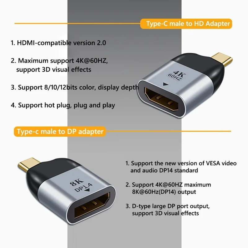 8K/4K 60Hz tipo C a USB 3.1/DP/Mini DP/VGA/compatible con HDMI/convertidor de enchufe de vídeo HD USB tipo C macho a hembra proyector teléfono móvil adaptador para portátil para Apple Huawei Samsung
