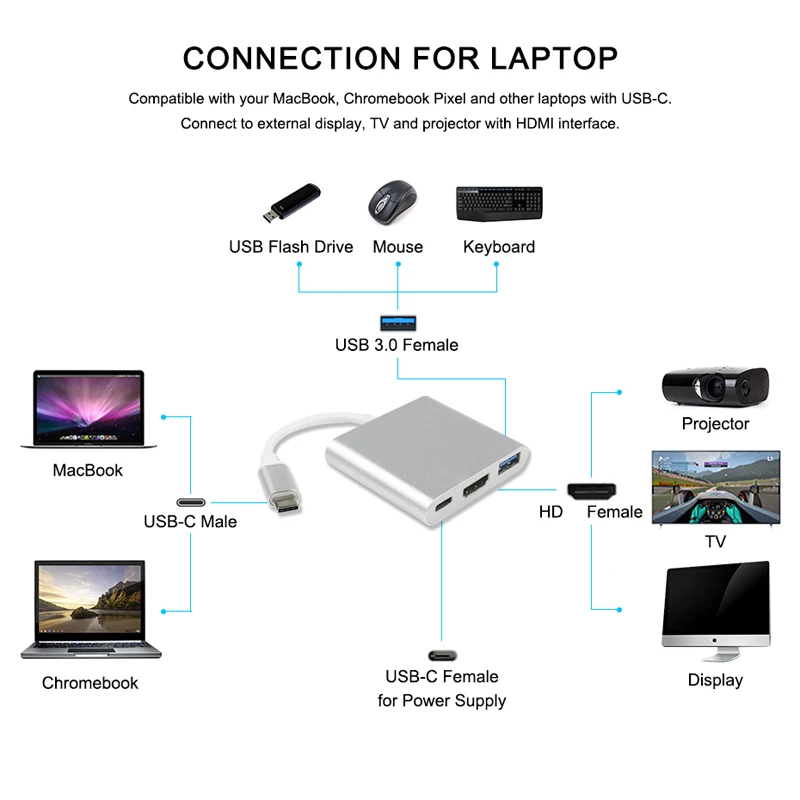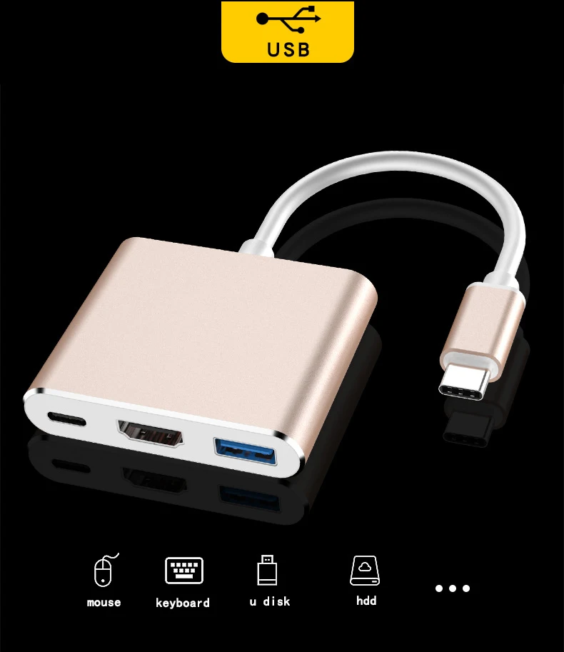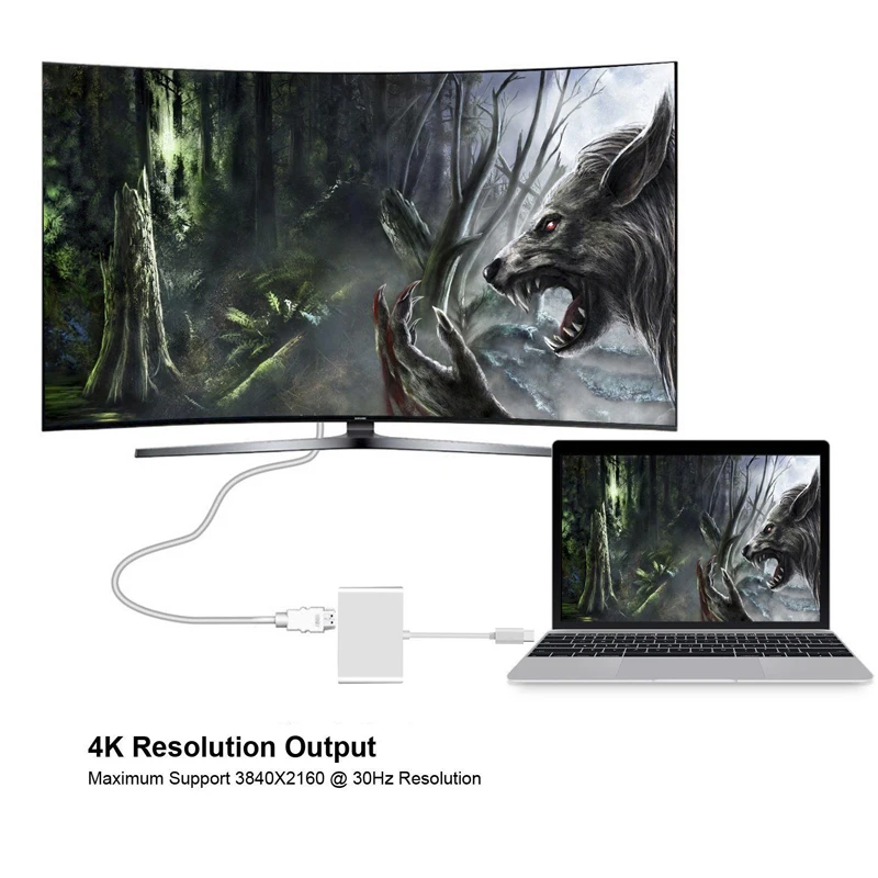 Función:Tipo C a USB 3,0 + Compatible con HDMI 4K + Carga A LA USB-C 3 en 1