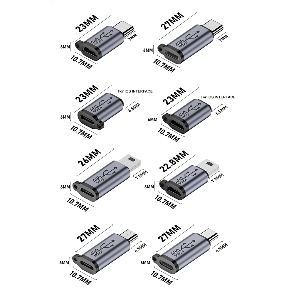 Tipo: Micro USB hembra a tipo C macho, Micro USB hembra a Mini USB macho, tipo C hembra a Micro USB macho, tipo C hembra a Mini USB macho, 8 pines hembra a tipo C macho, tipo C hembra convertir 8 pines macho, Micro USB hembra a 8 pines macho, 8 pines hembra a Micro USB macho