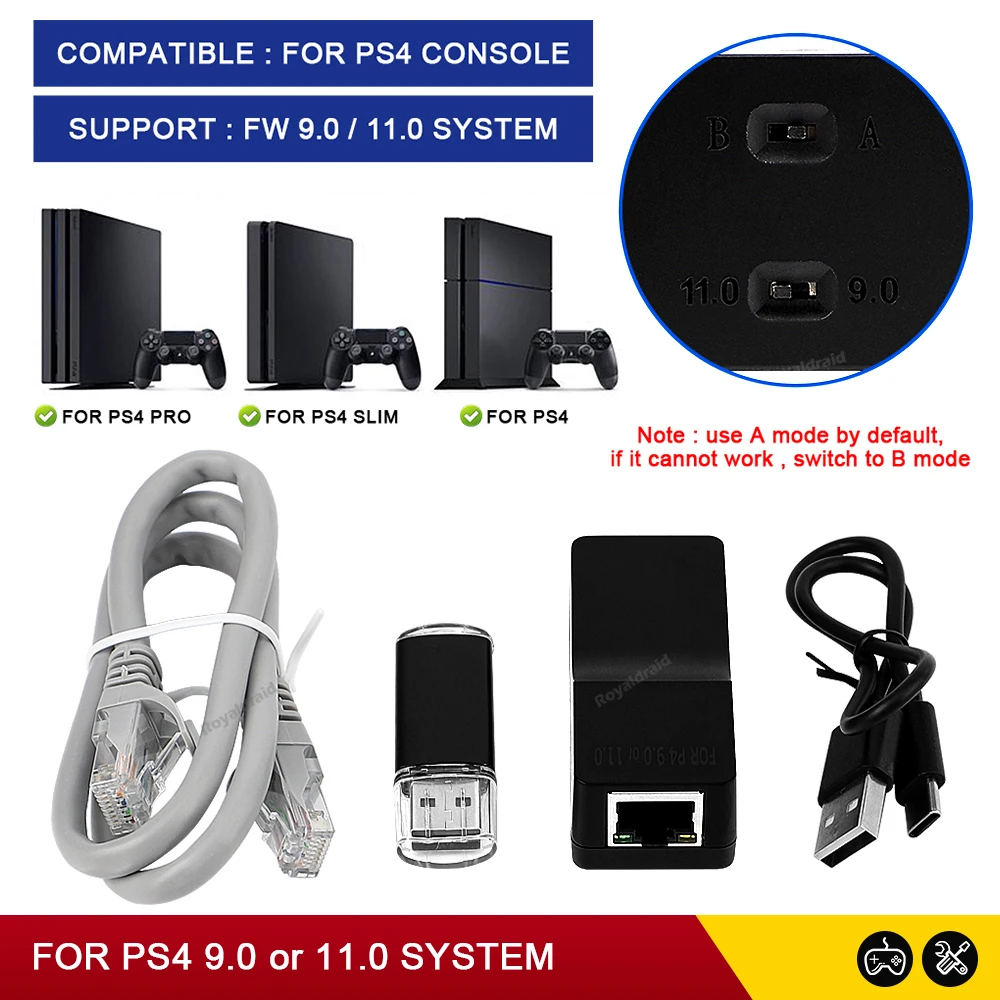 Descripción:Actualice el adaptador USB, cambie el botón para cambiar usando los sistemas FW9.0 y FW11.0.Si falla la energía de su consola cuando utilice el adaptador, elija la versión V2.0 pro y cambie el modo B.- Compatible con la herramienta de una tecla del sistema PS4 FW9.0/11.0.- Fácil de usar, plug and play, sin necesidad de configuraciones complejas.- Conecte su Ethernet y Type-Port a su consola.- El controlador USB sólo es necesario utilizar la primera vez.- El producto viene con un manual de instrucciones y puedes utilizarlo según los pasos del manual.El dispositivo JB 2.0, controlador USB (solo necesario por primera vez), cable tipo C, cable Ethernet, manual.Tenga en cuenta que la versión V2.PRO es compatible con todos los modelos de host de PS4.La versión V2.0 no es compatible con PS4 Slim CUH-22xx,CUH-xx15 CUH-xx17 PS4 Pro CUH-7206.El paquete incluye:1 dispositivo V2.0 Pro.1 x El controlador USB (solo necesita por primera vez)1 cable tipo C1 cable Ethernet1 manualNota: