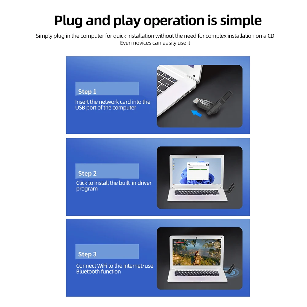 La tarjeta de red inalámbrica de doble banda + Bluetooth 5.4 es adecuada para la conexión inalámbrica de PC de escritorio y otros dispositivos, lo que puede proporcionar un acceso inalámbrico a Internet cómodo y rápido.La tarjeta de red admite la función de detección automática y puede ajustar automáticamente la velocidad.