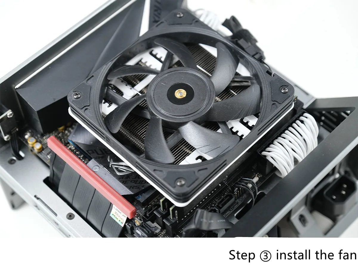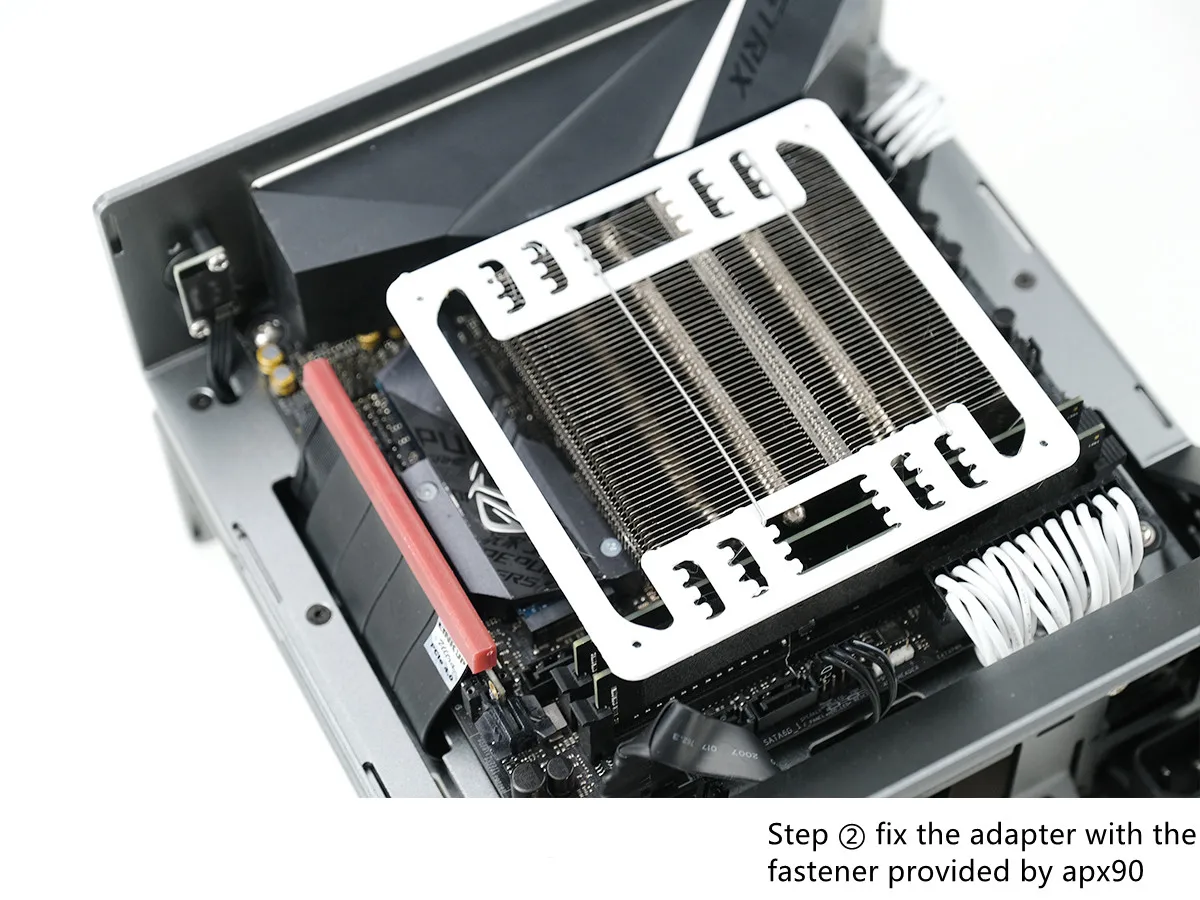3: El soporte del ventilador se fija con el sujetador de alambre de acero original de axp90 para resolver la vergüenza de que el radiador axp90 no tenga orificio de tornillo de instalación.