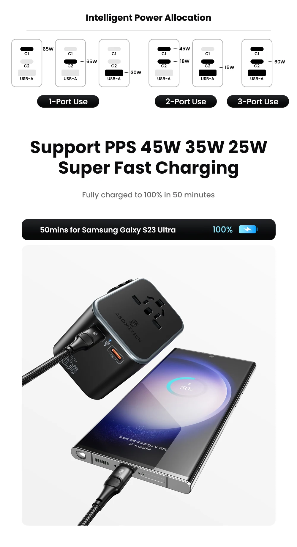 ASOMETECH - ADAPTO DE VIAJE GaN de 65 W